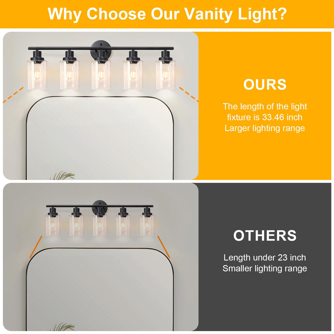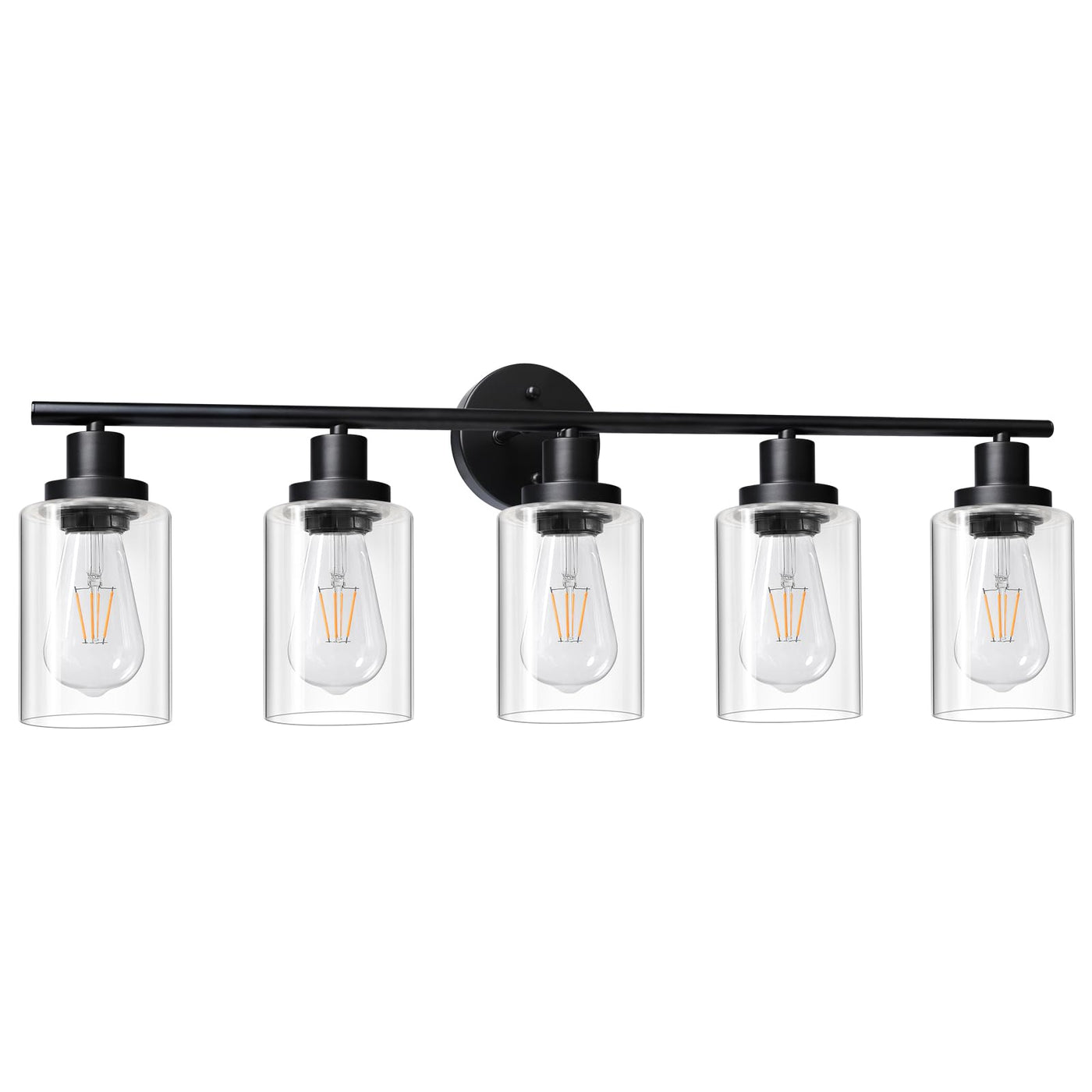 Unicozin Modern Bathroom Light Fixtures, 5 Light Vanity Lights, Black Wall Lamp With Clear Glass For Bathroom, Mirror, Living Ro