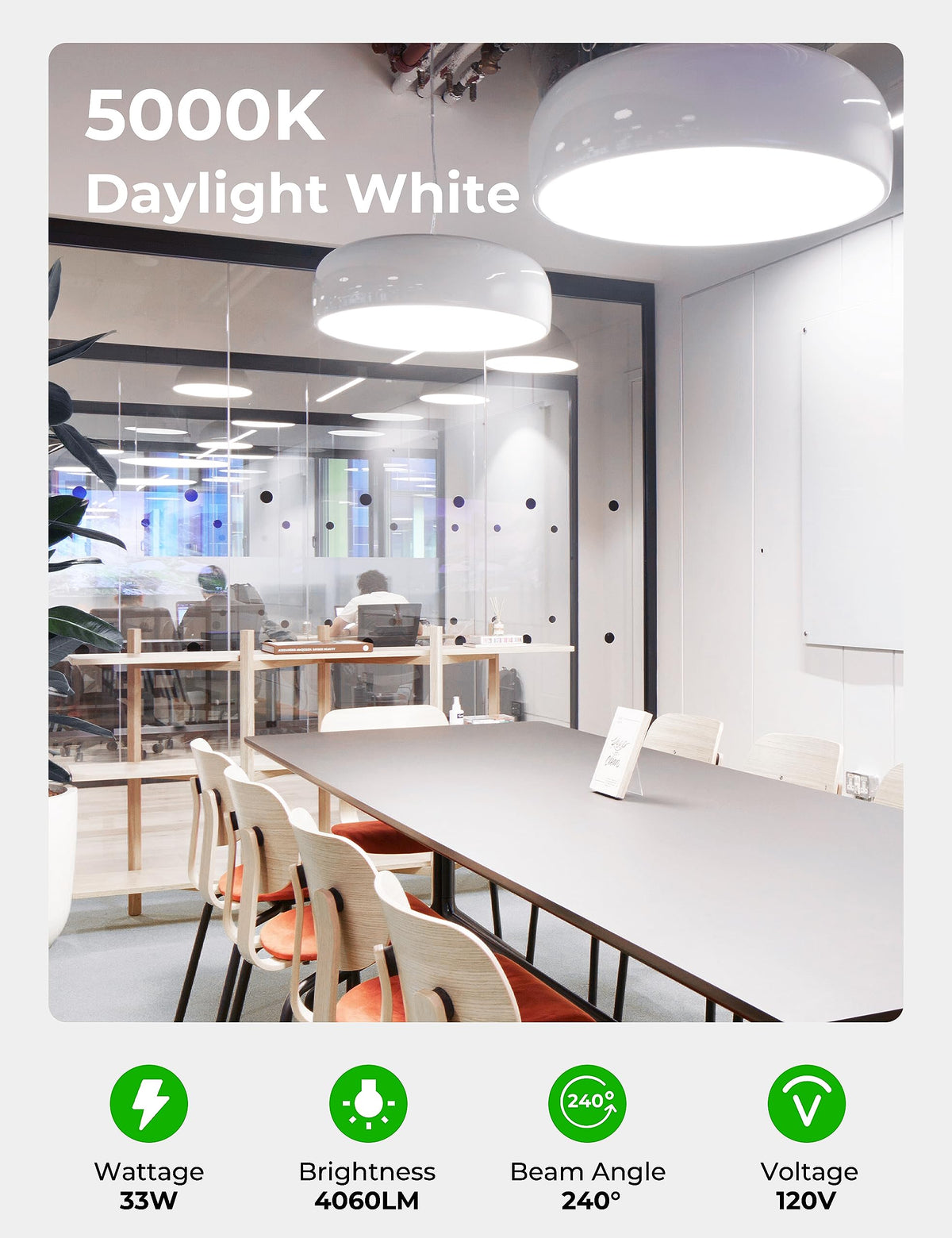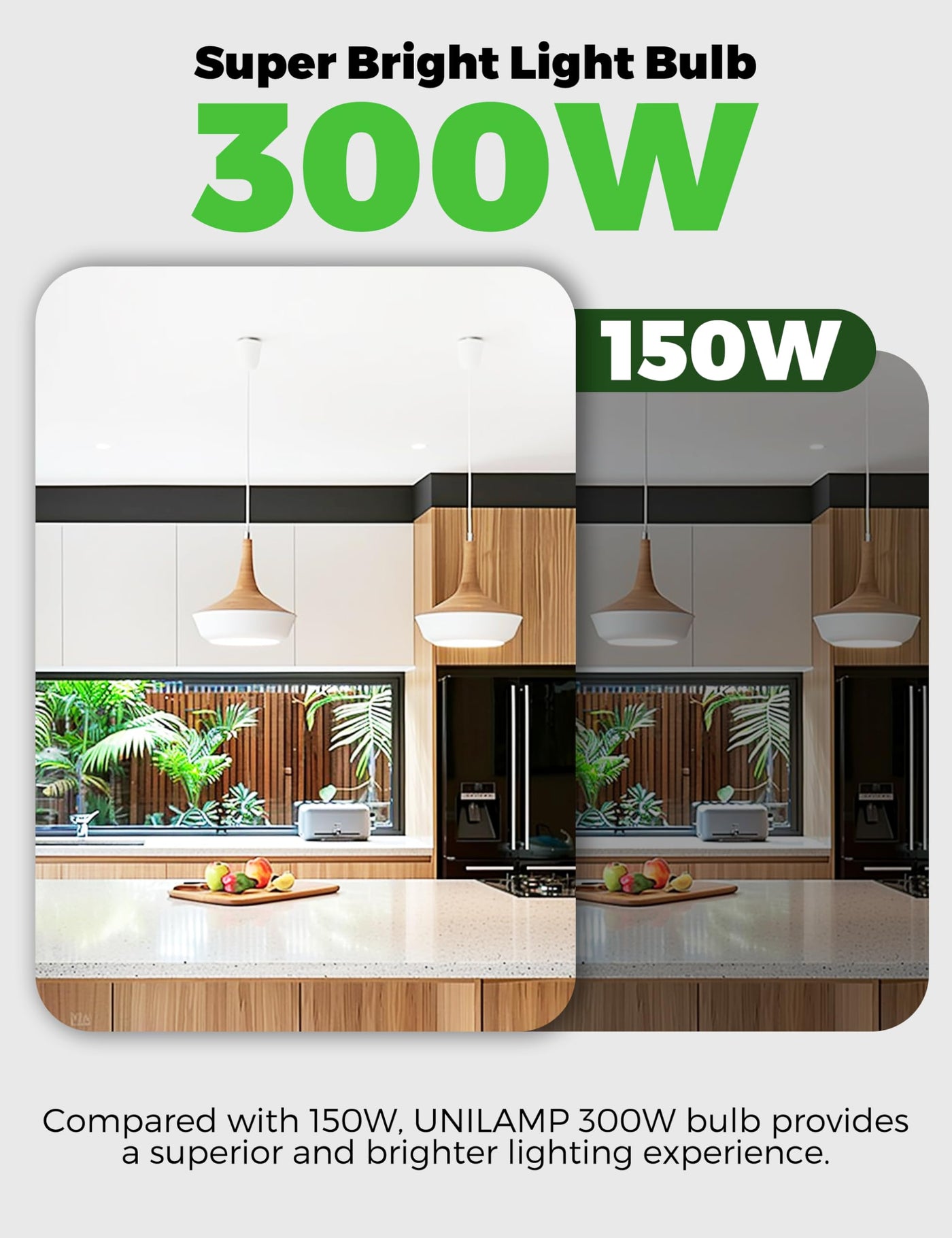 UNILAMP LED Light Bulb E26 base,A23 33W Light Bulb Equivalent 300W Incandescent LightBrand: UNILAMPNumber of Items: 2Colour: DaylightCap Type: E26Wattage: 33 WattsLuminous Flux: 4060 LumenColour Temperature: 5000 KelvinColour Rendering Index (CRI): 80.00Average Life: 25000 Hours Beam Angle: 240 Degrees Bulb Features: Non-DimmableWhy choose UNILAMP:UNILAMP focuses on producing lighting fixtures, our company has always insisted on quality assurance to provide our customers with better products and give you a better sense of product experience.