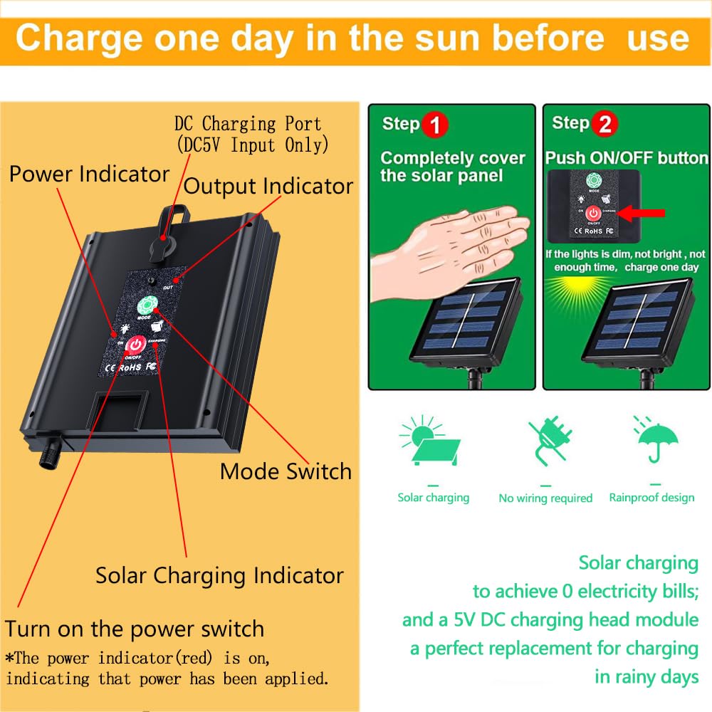 Solar Powered: Equipped with an adjustable solar panel and rechargeable battery for efficient energy use, eliminating the need for electricity.
