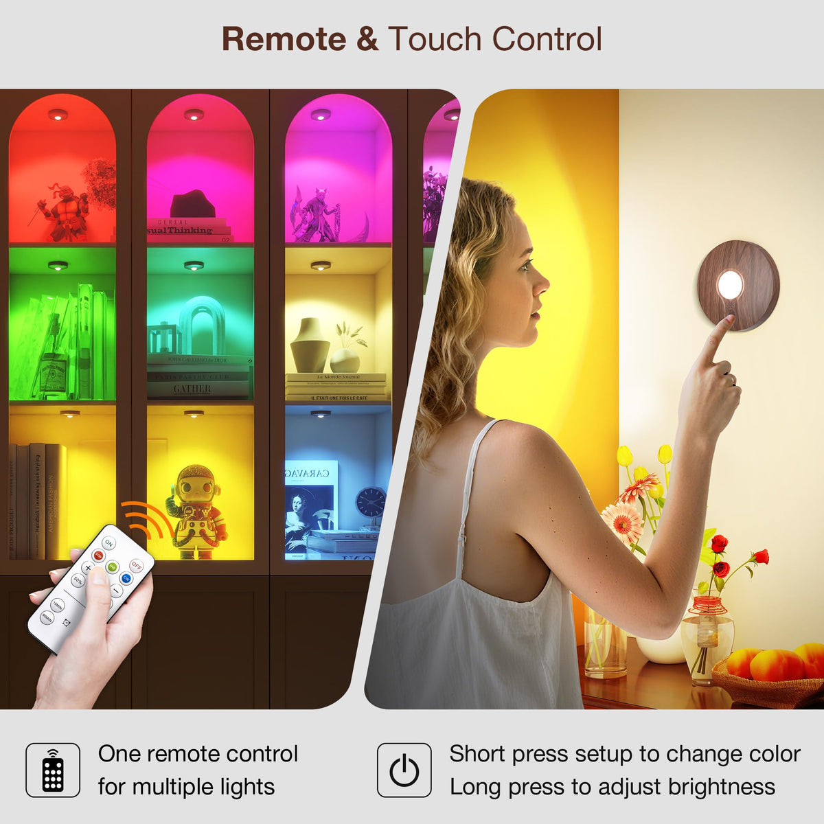 UNUSROOM Rechargeable RGB Puck Lights, 2000mAh Battery, Remote Control, Dimmable, Magnetic Mount, Dark Wood, Model T065