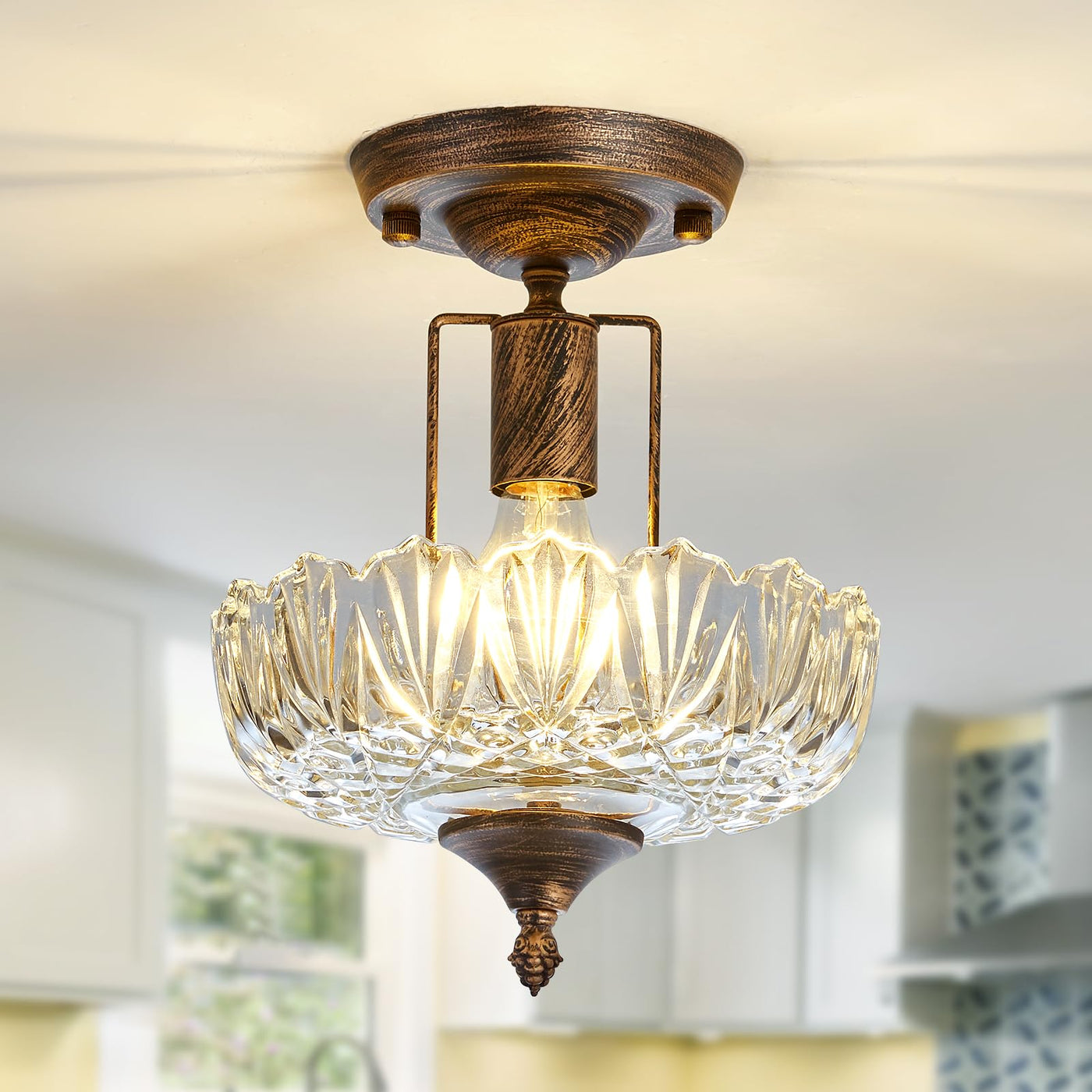 Q: What are the dimensions of this ceiling light fixture?A: This vintage small semi flush mount chandelier has dimensions of 11.81 inches in height and 9.25 inches in width, making it suitable for various indoor lighting applications such as hallways, bedrooms, bathrooms, and more.