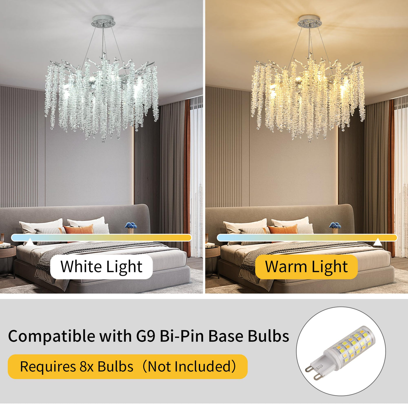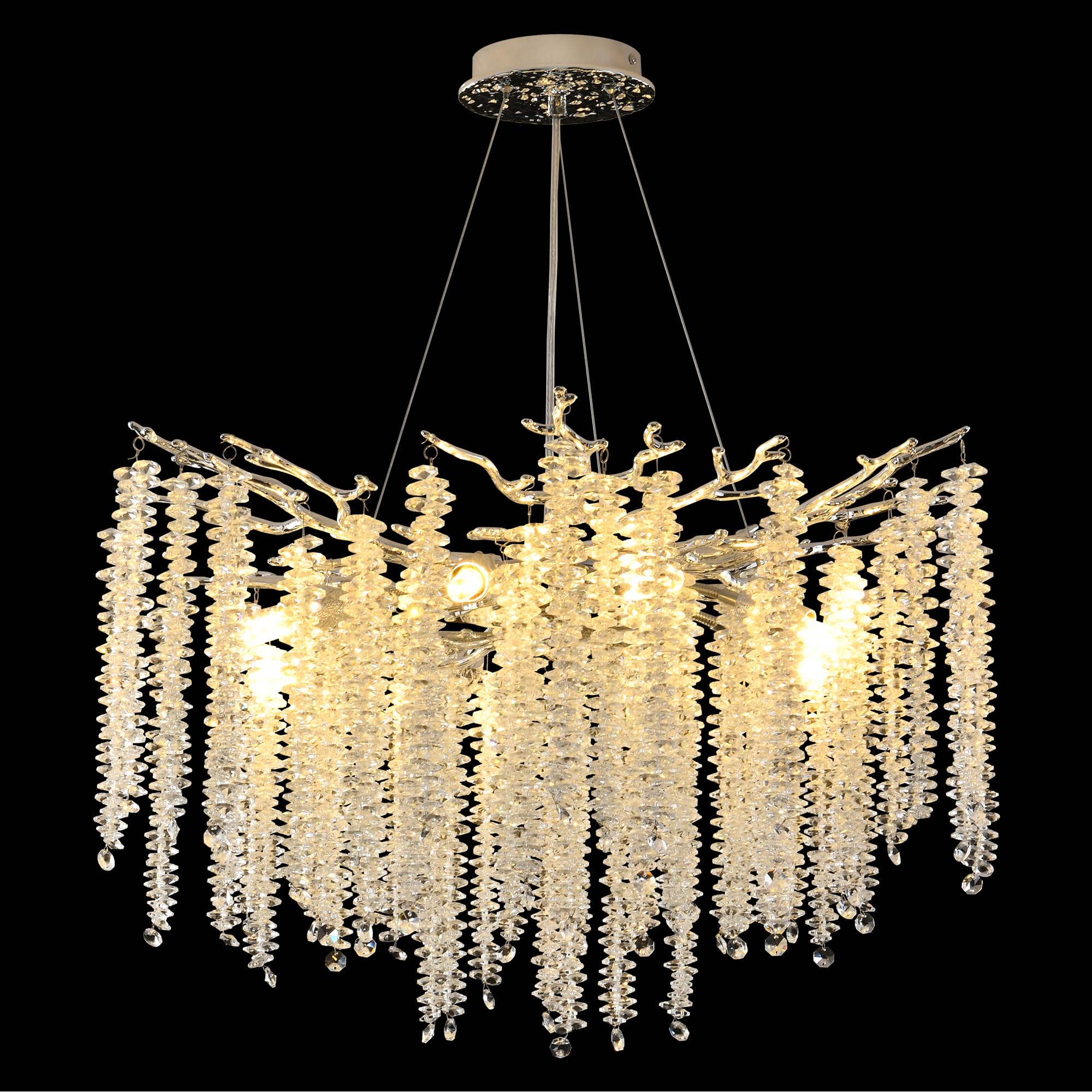 ? ? ABOUT UPFELW ? ?Upfelw is a Reputable & Reliable chandeliers manufacturer located in Shenzhen China;We have been committed to providing high-quality chandelier light fixtures and first-class services to every customer. We work with many home designers and help them to make their designs or idea into reality by providing the technical solution to achieve them. We are the expert chandeliers manufacturing with our own factory.? ? WHY CHOOSE UPFELW CRYSTAL CHANDELIER ? ??? High Quality K9 Clear Crystal;?? Golden Finished Handcrafted Aluminum Tree Branch;?? Designed with Standard G9 Light Socket, Bulb Easy to Replace;??Compatible with G4 Bi-Pin Base Bulbs (bulb not included);?? Modern Elegant Looking Design;?? Minimum Assembly Required;?? Lifetime After-Sales Customer Service Support;? ? Chandelier Light Fixture Specifications ? ??? Light Fixture Type: Modern Crystal Chandelier?? Material: Aluminium, Crystal?? Color: Gold?? Finish: Painted??Canopy Size: 1.2'' H x5.9 '' W x 5.9'' D?? Height: height adjustable?? Overall Maximum Height: 79 inch?? Bulb: G9 Bulb(not included)?? Mounting Type: Ceiling Mount, Hanging?? Sloped Ceiling Compatible: Yes?? Dry, Damp or Wet Location Listed: Dry?? Voltage: 110 Volt?? Applicable Places: living room, dining room, bedroom, staircase, foyer, entryway, 2-story loft, ect?? Warranty Length: 2 Year? ? Warm Tips ? ?? ? Please check the dimensions of the product before ordering to ensure it fits your home. ? ? We provide install instructions for you. If its hard to install of you, please rent a licensed electrician to do this for you.