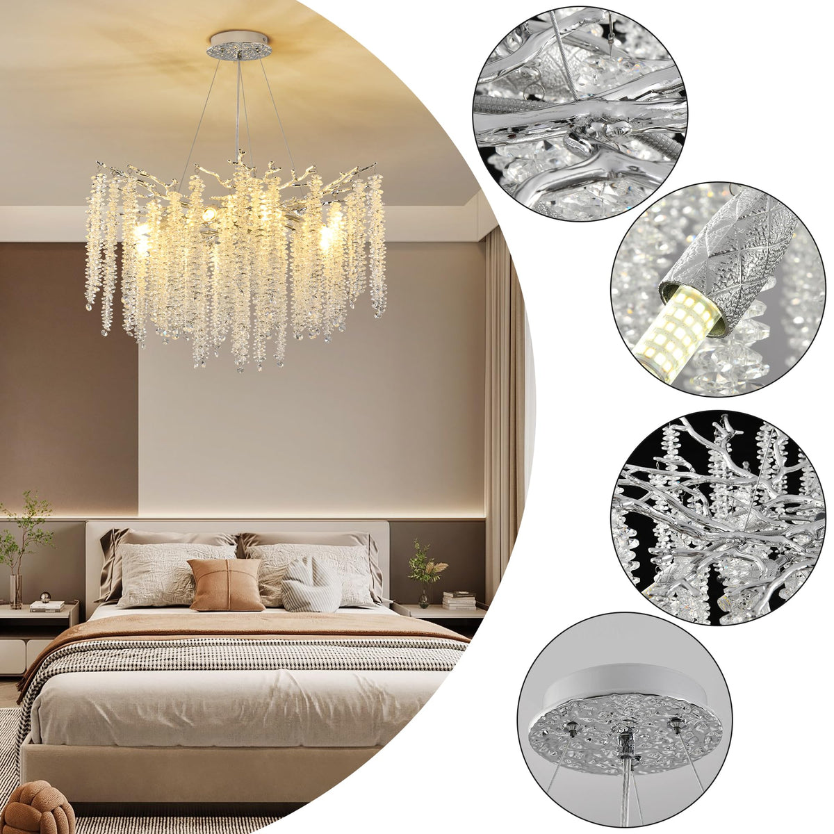 Upfelw Modern Crystal Tree Branch Chandelier, Chrome Round Art Deco Raindrop Lighting Fixture For Dining Room Bedroom Foyer 6 Li
