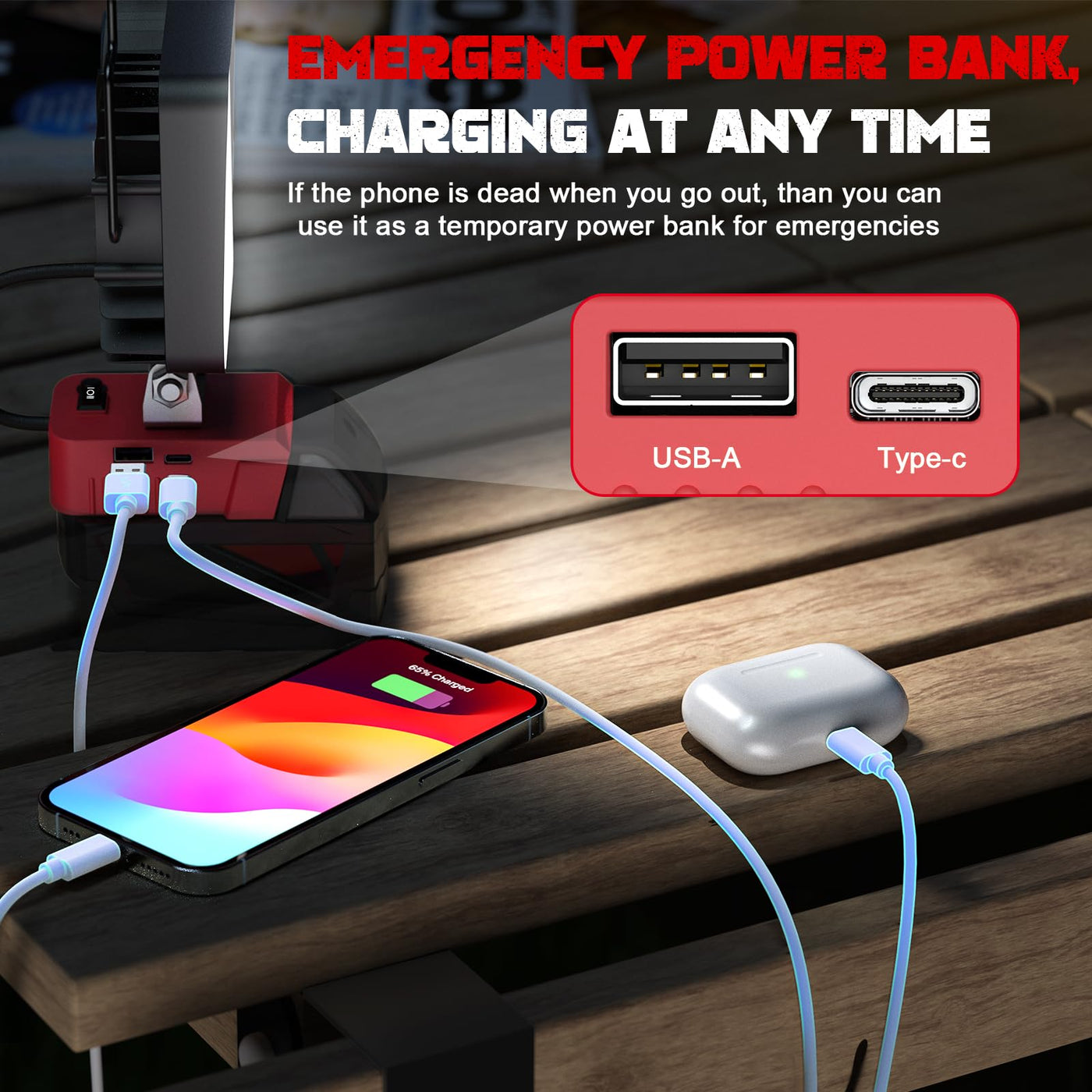 Q: Does the work light have charging capabilities for other devices?A: Yes, the work light is equipped with USB and Type-C ports, enabling you to charge phones, tablets, and other devices while you use the light, making it perfect for outdoor activities and job site delays.