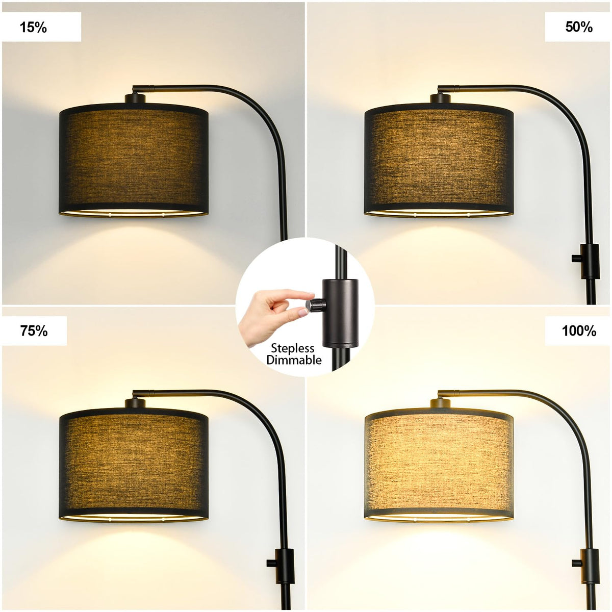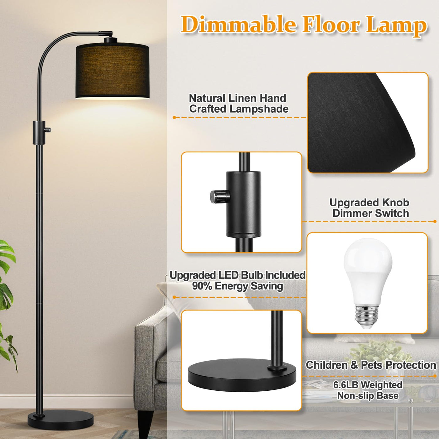 Q: What are the main features of the upgraded dimmable black floor lamp?A: The upgraded dimmable black floor lamp features a 0-100% fully dimmable brightness, allowing you to customize lighting to your preference. It includes a flexible lampshade that can rotate 360° horizontally and 90° vertically, a 1200 lumens dimmable LED bulb, and a stylish design suitable for various room styles.