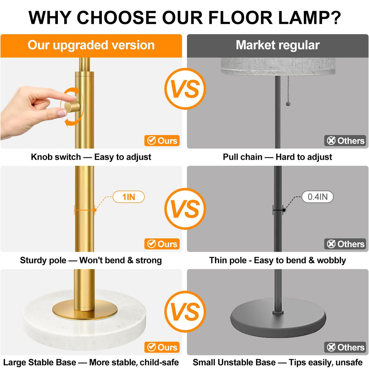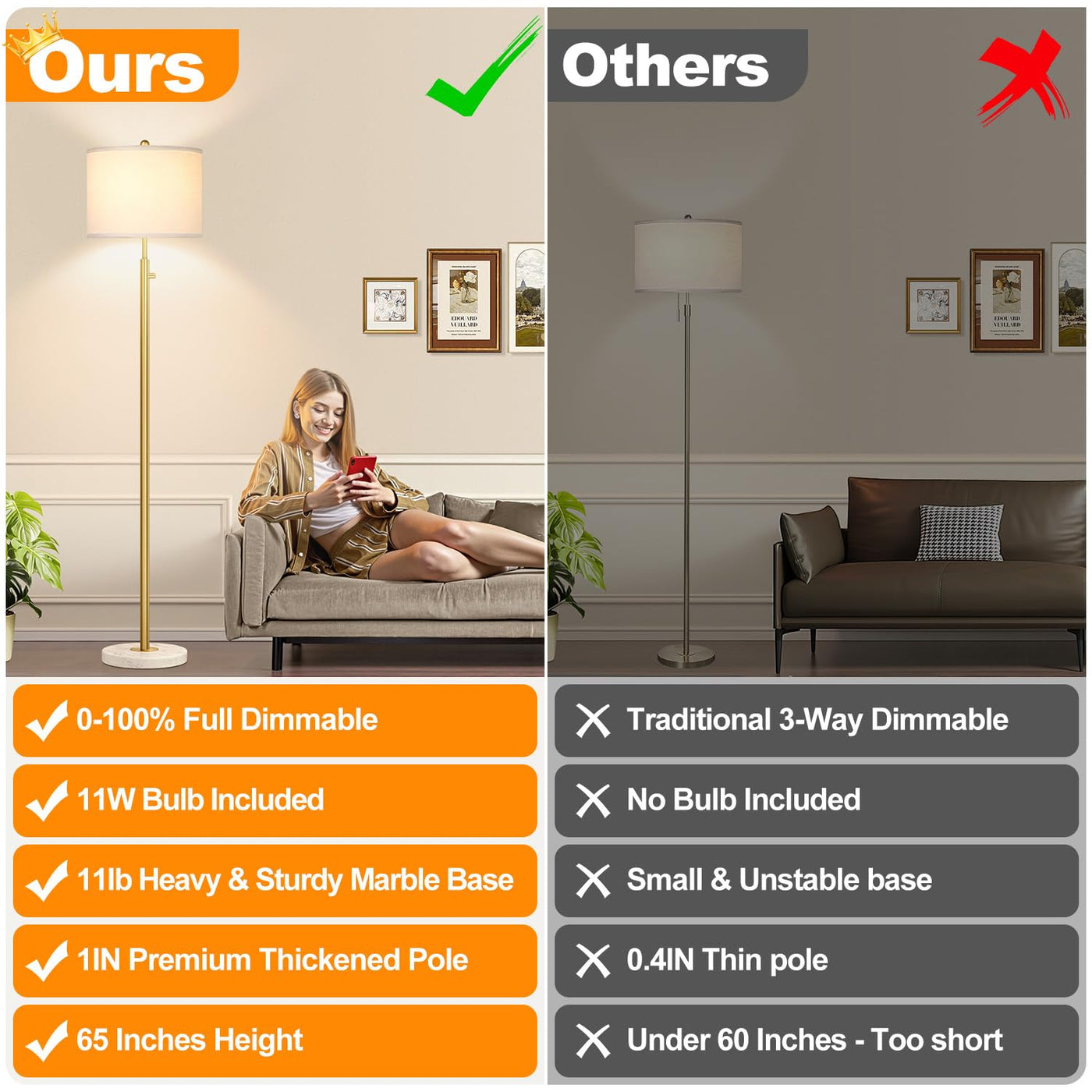 ?Upgraded?Dimmable Gold Floor Lamp For Living Room, 11W Led Bulb Included, Modern Standing Lamp With Marble Base, Tall Pole Ligh