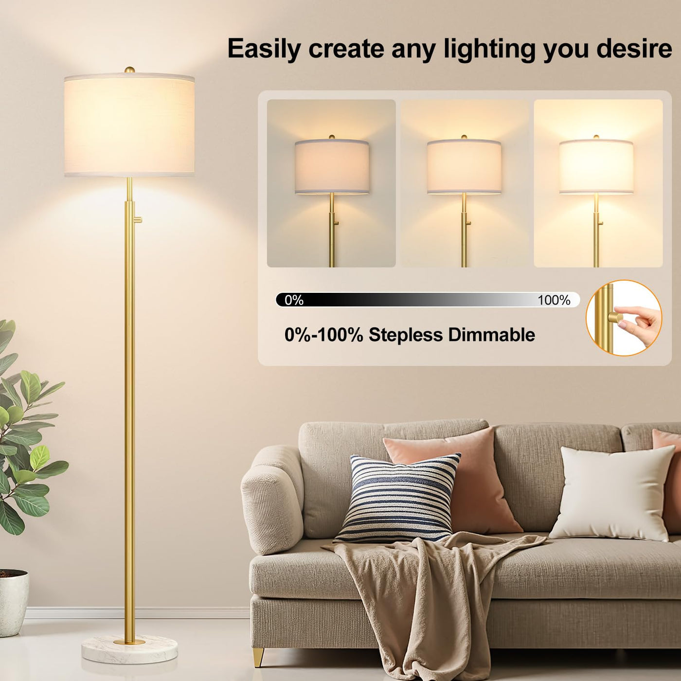 Dimmable Gold Floor Lamp For Living Room, Super Bright 11W Led Bulb Included, Modern Standing Lamp With Marble Base, Tall Lamp With White Linen Shade For Bedroom Reading Office