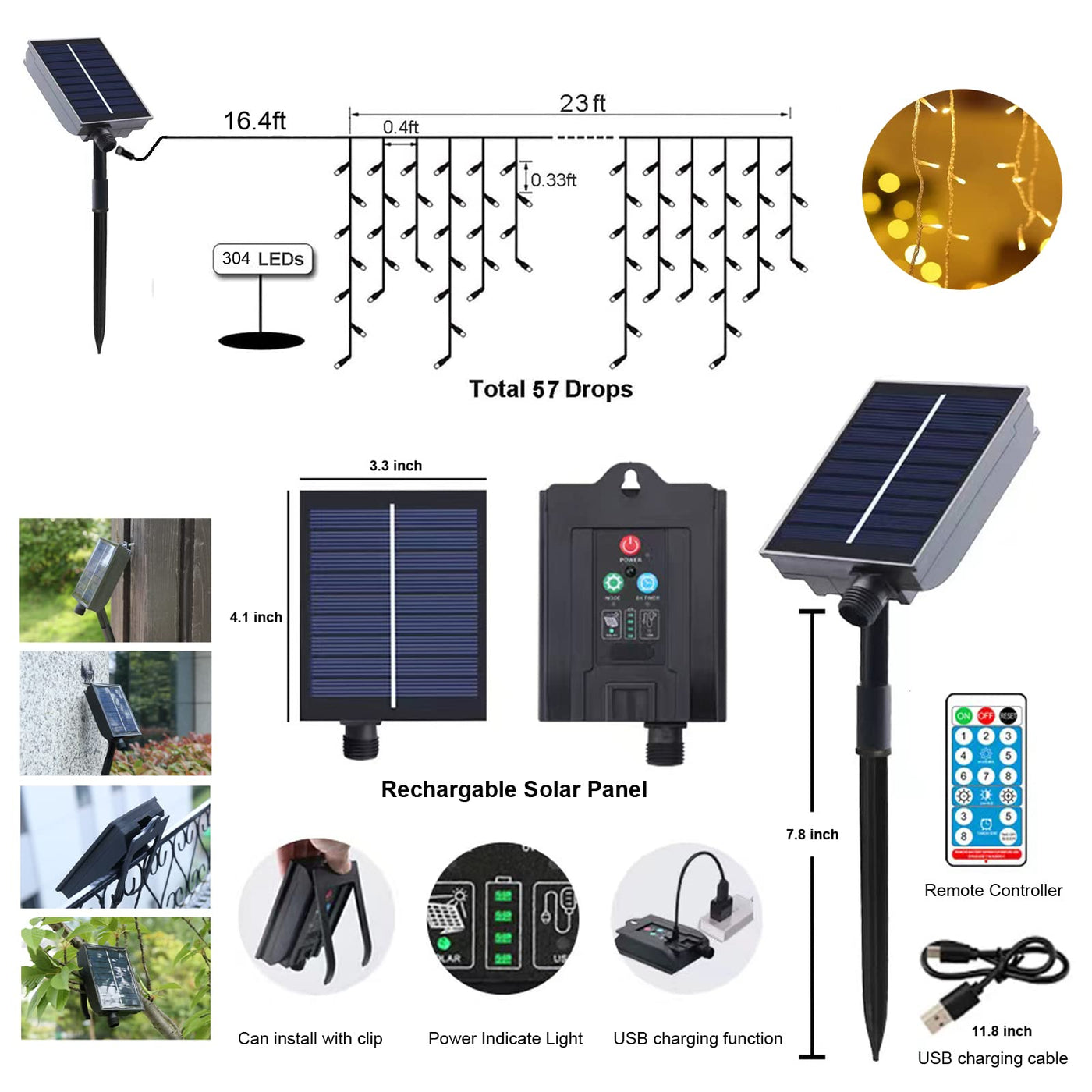 Q: How do I install the Upgraded Solar Christmas Icicle Lights?A: Installation is simple; you can clamp the solar panel to a fence or branches using the provided clip. The 16.4ft leading wire allows flexibility in positioning the lights around your home, including roofs, patios, and trees.