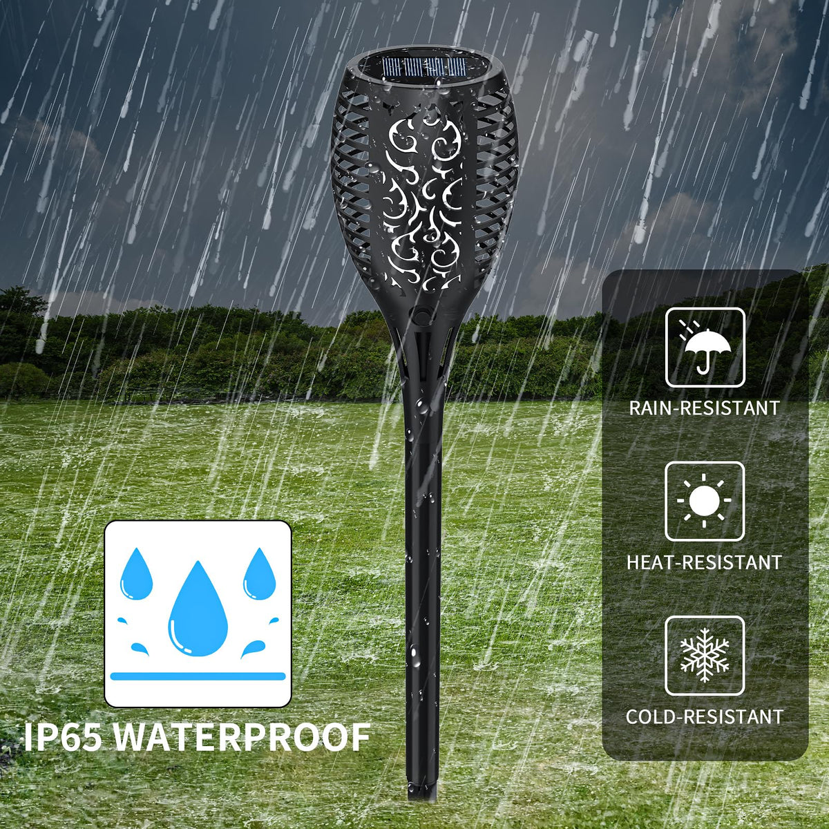 Q: Do the solar lights turn on automatically?A: Yes, these solar torch lights automatically turn on at dusk and turn off at dawn, thanks to their built-in light sensor, providing hassle-free operation.
