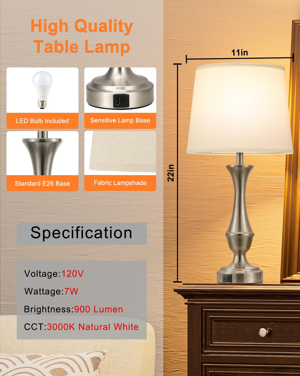 Q: What types of bulbs are included with the lamps?A: The upgraded touch lamps come with two premium E26 LED bulbs included, which are specifically designed for optimal performance with the 3-way dimmable functionality. This ensures a flicker-free and ultra-quiet operation, enhancing your overall lighting experience.