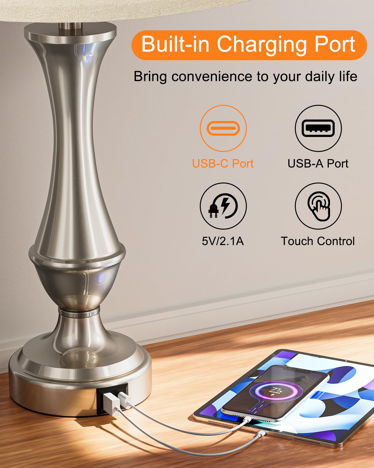 Q: Can I charge my devices while the lamps are turned off?A: Yes, the upgraded USB-C and USB-A ports on the touch lamp base allow you to charge your devices even when the lamps are turned off. This feature makes it easy to keep your devices powered without needing to turn on the lamps.