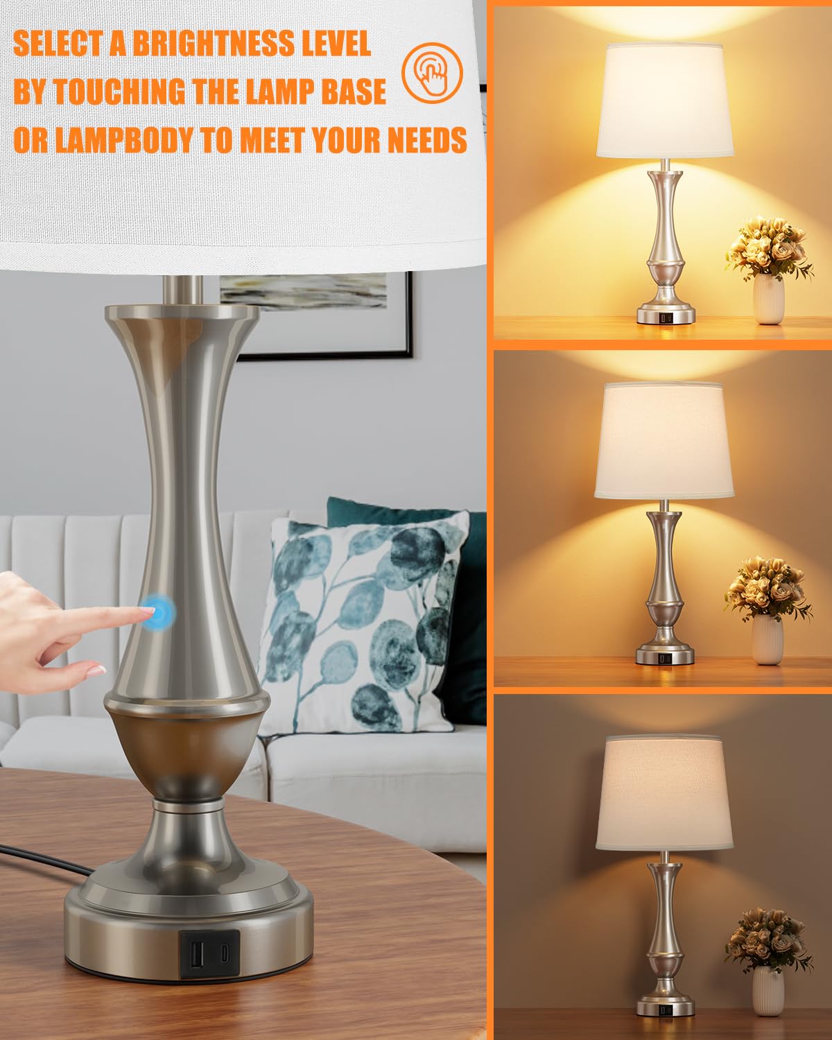 Upgraded Touch Lamps For Night Stands Set Of 2 - Bedside Lamps With Usb C+A, 3 Way Dimmable For Bedroom Living Room End Tables O