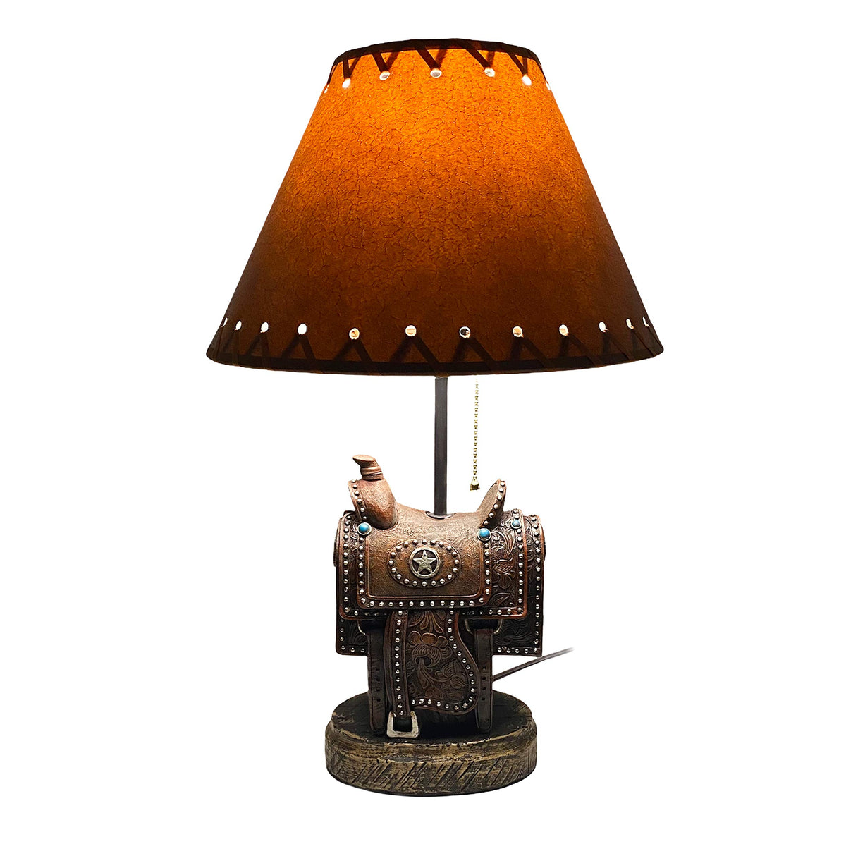 - **Rustic Western Lodge Style**: Featuring an antique leather wash finish, this lamp embodies the rugged elegance of cowboy culture. The striking silver star and rhinestone details enhance its aesthetic, making it a standout piece in your rustic den or country cabin.