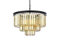 Q: What materials are used in the construction of this chandelier?A: The chandelier is made of steel metal with a matte black finish, featuring three stunning layers of royal-cut golden-teak crystals for an elegant look.