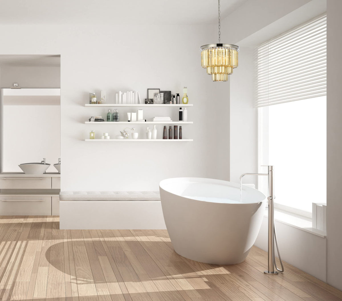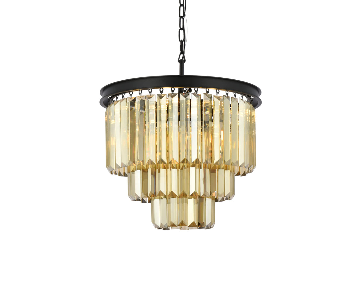 Q: What is the finish of the Urban Classics Sydney Chandelier?A: The Sydney Chandelier features a matte black finish, which adds a sophisticated touch to any décor and complements the stunning layers of royal-cut golden-teak crystals.