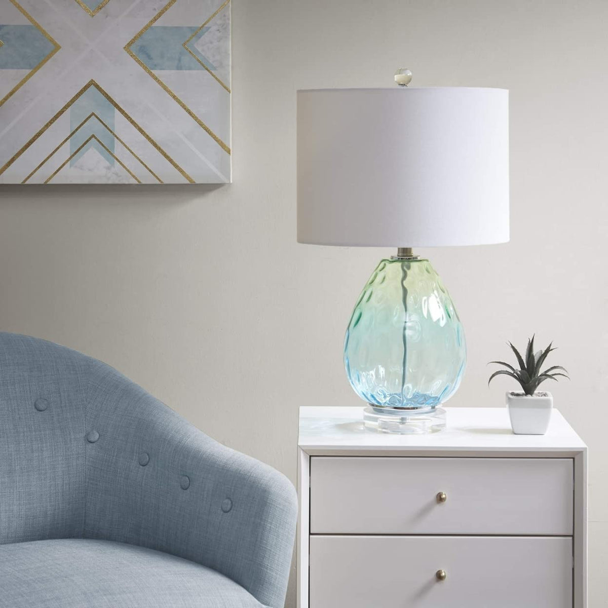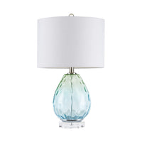 Illuminate your living space with the stunning Borel Ombre Glass Table Lamp from Urban Habitat. This beautifully designed lamp showcases an exquisite blend of blue and green hues, bringing a touch of elegance and warmth to any room. The sophisticated white drum-shaped shade complements the glass base, softly filtering light to create a cozy ambiance. Perfect for both modern and traditional décor, this lamp is an ideal addition to your living room, bedroom, or office.
