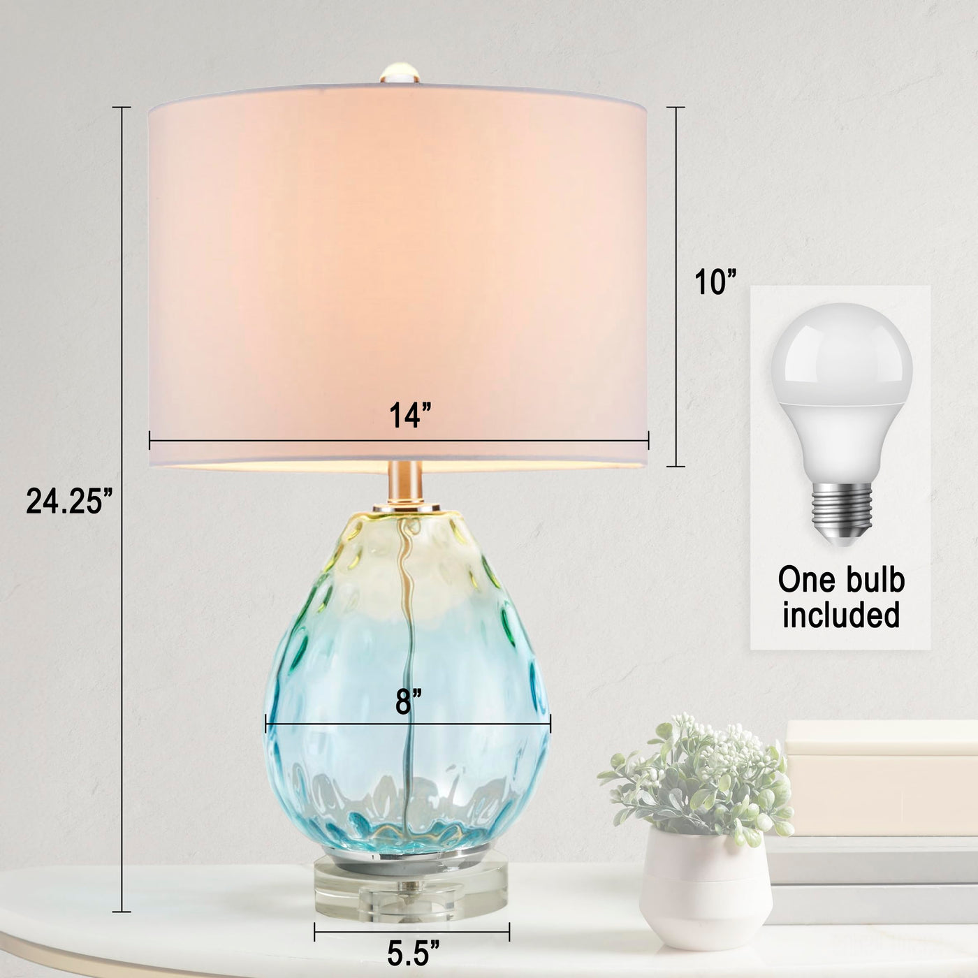 Q: What are the dimensions of the Borel Ombre Glass Table Lamp?A: The Borel Ombre Glass Table Lamp has a diameter of 14 inches and a height of 24.25 inches. The body size is 8 inches in diameter and 16.5 inches in height, while the shade size is 14 inches in diameter and 10 inches in height.
