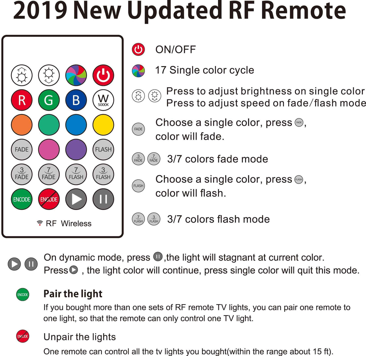 Feature: Applications: For 48''-55'' Behind Tv Lighting / Monitor Home / Theater Decoration Light. Please Note: The Light Was Upgraded From 4 Pieces Pre-Cut Strip To One Long S-Type Strip Can Cover 4/4 Side Of The Tv. Size Of Led Strip: 11.5Ft Black Led Strips. Led Chip:Rgb 3528 Smd Led, High Intensity And Reliability. Attation: The Power Of The Light Is 5W( Dc5V, 1A), Please Check Usb Output Prior To Use. Send Email To Us If You Need Any Help. Question 1: How Can The Rgb Led Tv Light Relieve Eye Strain? Answer: When You Are Watching Tv In A Dark Room, The Tv Is A Bright And Flickering Lighting Source. Looking Directly At The Light Source For A Long Time Could Really Cause Eye Pain And Visual Problems. It'S Like Your Mom May Have Told You: ''Don'T Get Too Close To The Tv And Turn On A Light When It'S Too Dark. The Tv Light Will Gently Light Up Your Room And Give You A Wonderful Watching Time; Most Important, It Will Take Care Of Your Eyes. Question 2: Does The Tv Light Turn On/Off With The Tv? Answer: For Most Of All Tvs, The Light Will Turn On/Off With The Tv. For A Few Kinds Of Tv, You Need To Use The Remote. Question 3: Does The 3M Tape Will Stay For A Long Time? Answer: Yes, The Tape Is 3M Vhb Tape, It Will Be More Sticky When Get Heated(Working Tv Will Generate Heat). But Please Remember, Clean The Back Surface Of The Tv Before Sticking. Question 4: Is This An Rf Or Ir Remote? Answer:This Is A Rf Wireless Remote(Updated). Question 5:I Bought More Than One Set Of Rf Remote Tv Lights, And Want One Remote To Control Only One Light, How To Pair The Remote With Tv Lights? 1), Unplug All Tv Lights From Your Tv. 2), Plug One Tv Light, And Press ''Encode'' Synchronously In 3 Seconds When Plugged. 3),Tv Light Will Flash Once Or Twice, Then Paired.