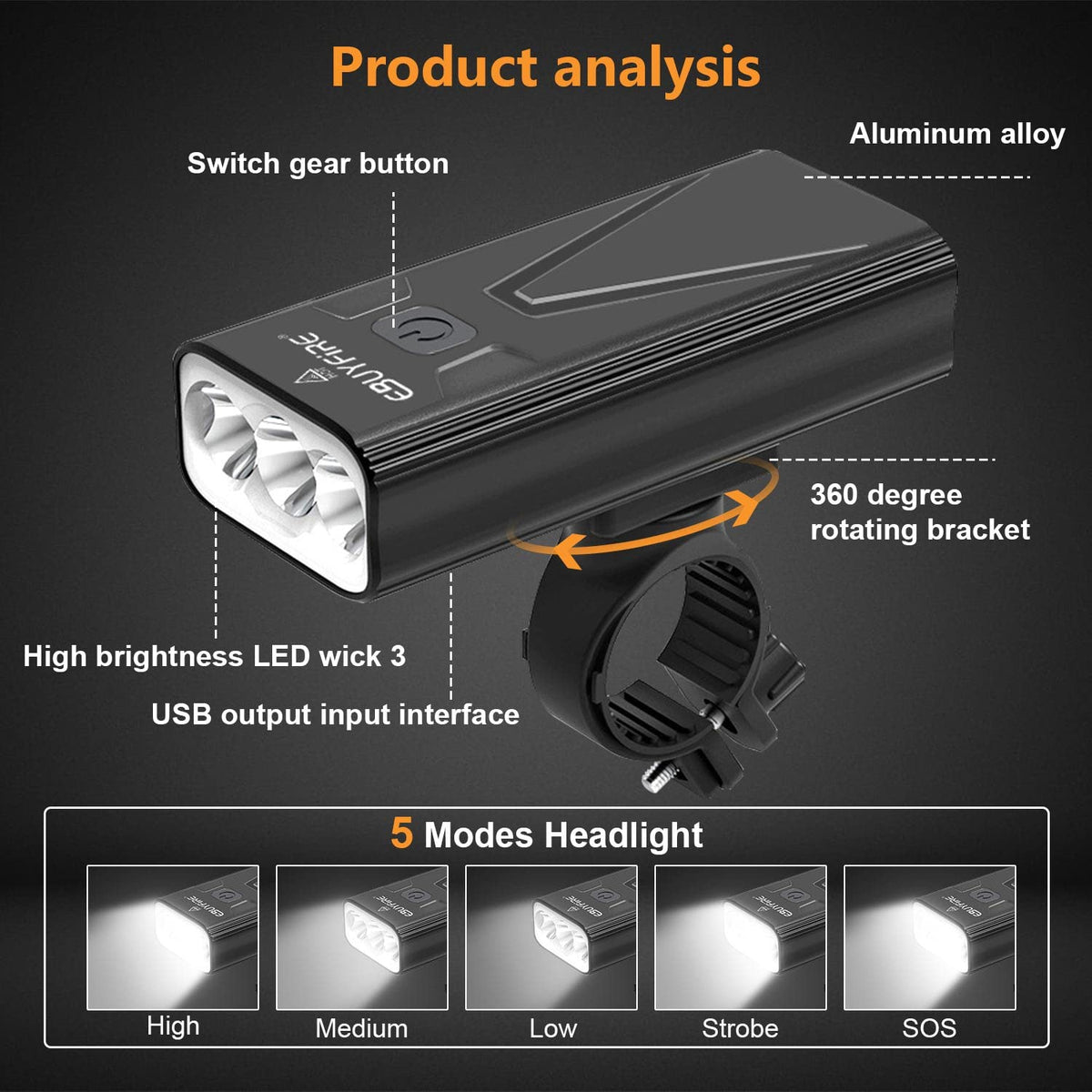 Q: What are the different lighting modes available?A: The bike light offers three or five lighting modes, including High, Medium, Low, Strobe, and SOS, giving you flexibility to choose the best mode for your needs.