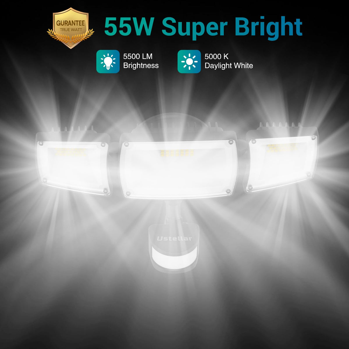 Q: How bright is the USTELLAR 55W LED Security Light?A: The USTELLAR 55W LED Security Light offers an impressive brightness of 5500 lumens, making it significantly brighter than many traditional security lights and an excellent choice for illuminating areas like garages, backyards, and patios.