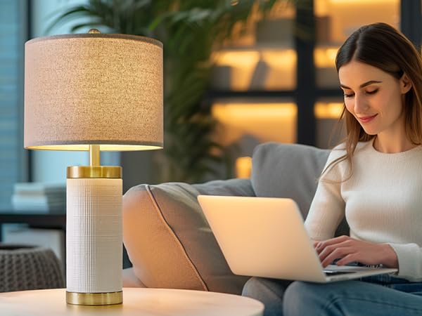Q: Is the lamp suitable for reading or working?A: Yes, the USumkky table lamp is designed with an eye-caring feature, emitting soft and non-glaring light through its white fabric lampshade. This makes it perfect for reading or working, providing a comfortable ambiance without straining your eyes.