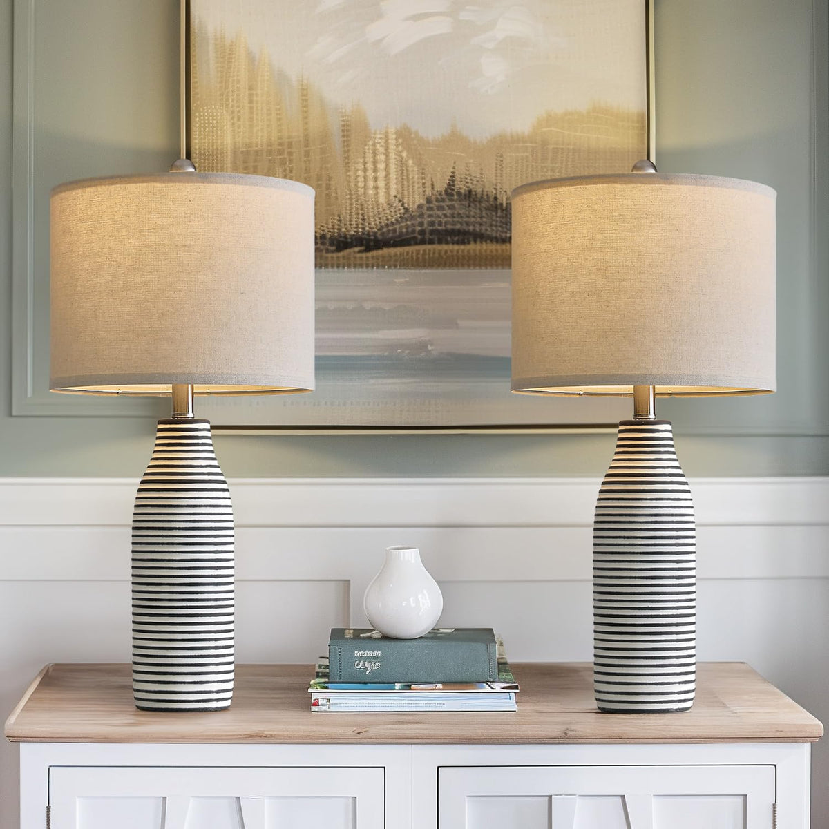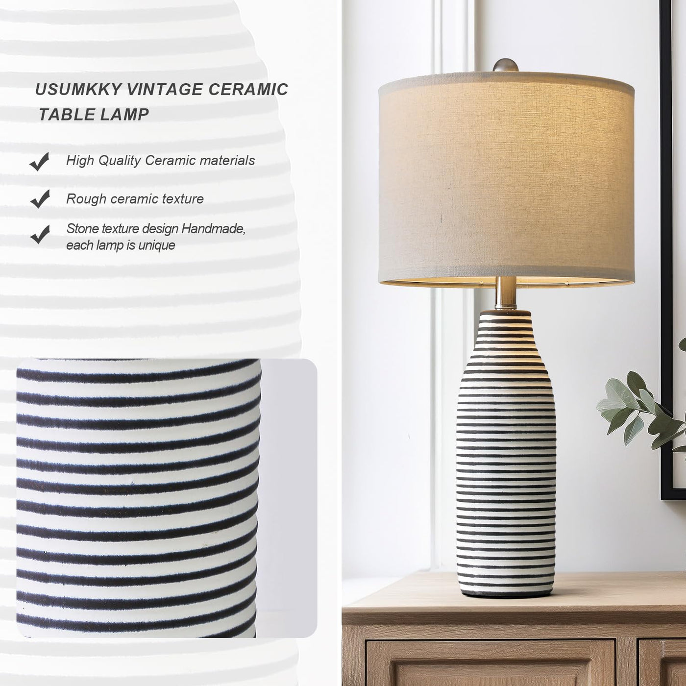 USumkky 25'' Ceramic Table Lamps Set of 2 Beside Lamps for Living Room Modern Bedroom Lamps for Night Stands with Rotary Switch Black and White Stripes