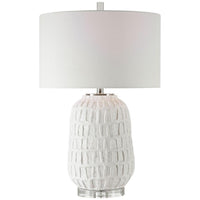 Q: What materials are used in the construction of this table lamp?A: This table lamp is crafted from high-quality steel and features a beautiful combination of matte white, polished nickel, and crystal accents, ensuring both durability and style.