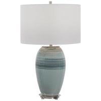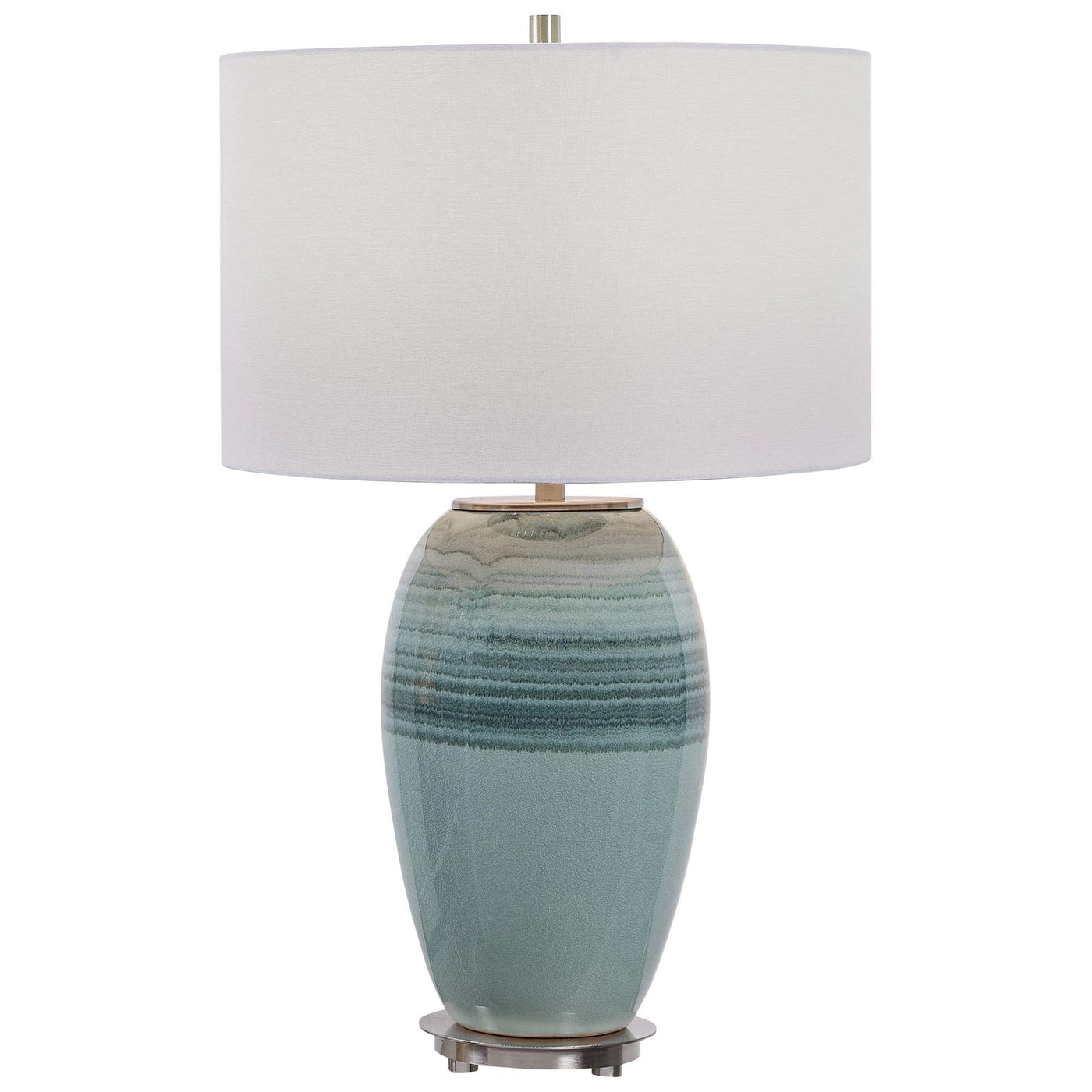 Collection: Caicos, Material: Iron, Finish Color: Aqua/Teal Crackle Glaze/Brushed Nickel, Width: 16", Height: 26.5", Depth: 16", Number Of Bulbs: 1, Wattage: 150 Watts, Dimmable: No, Moisture Rating: Dry Rated, Desc: This Ceramic Table Lamp Is Finished In A Beautiful Aqua And Teal Crackle Glaze Paired With Brushed Nickel Plated Accents That Add An Elegant Touch To The Piece. The Lamp Is Complimented By A White Linen Fabric Drum Shade. Osvaldo Mendoza / Shade Included: Yes. ,