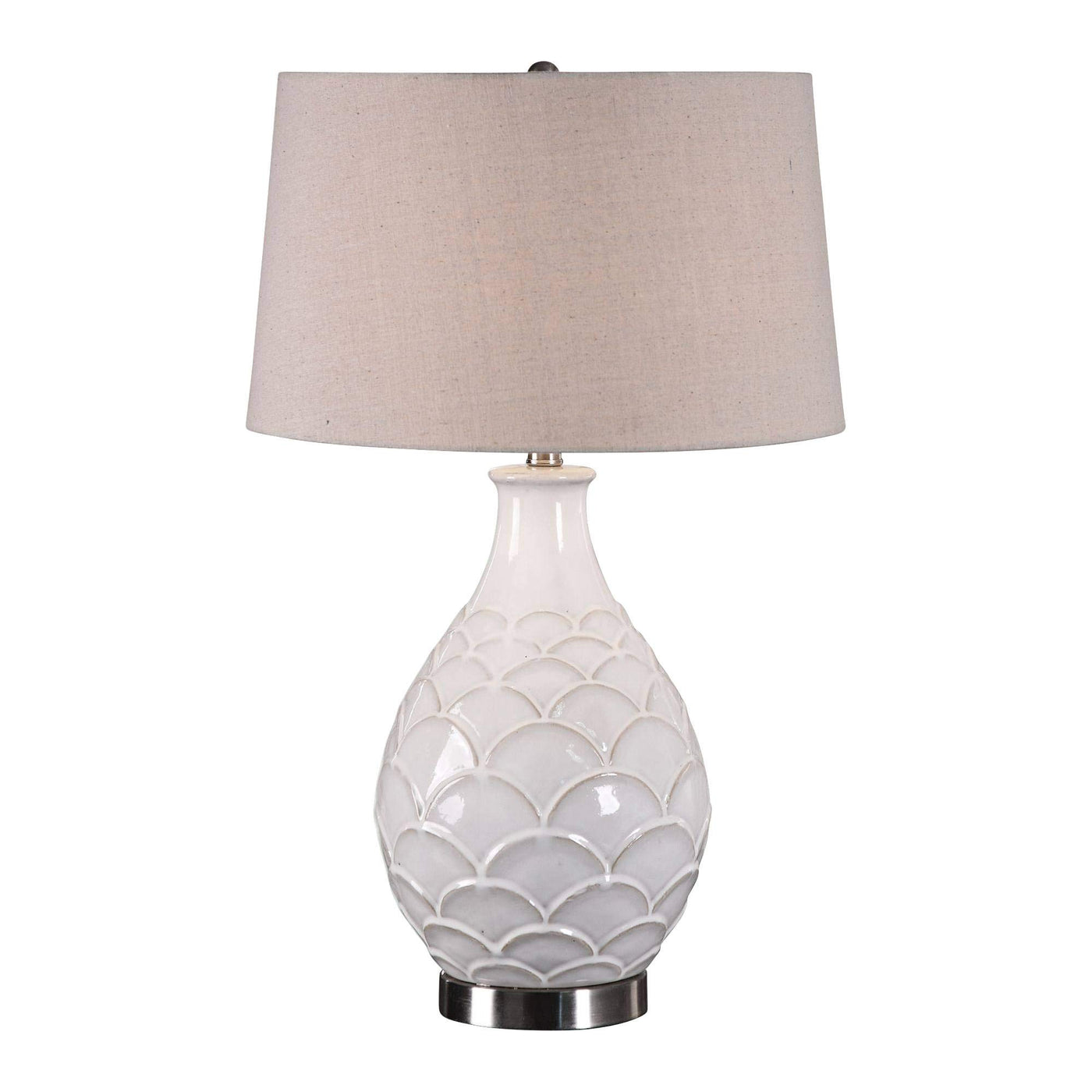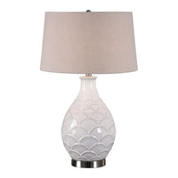 Q: Is the Uttermost Camellia Table Lamp suitable for a variety of decor styles?A: Yes, the distressed glossed white glaze and brushed nickel finish make it a versatile piece that complements various decor styles, from modern to traditional.