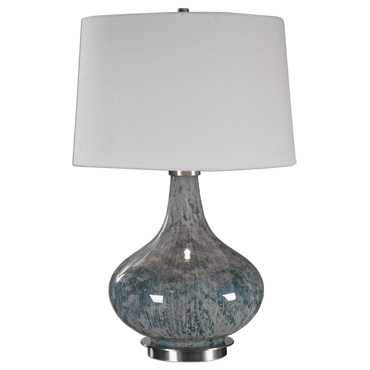 Q: What materials is the Uttermost Celinda Table Lamp made from?A: This table lamp features a combination of glass, metal, and fabric, with a brushed brass finish and a mottled/light blue gray glass shade.