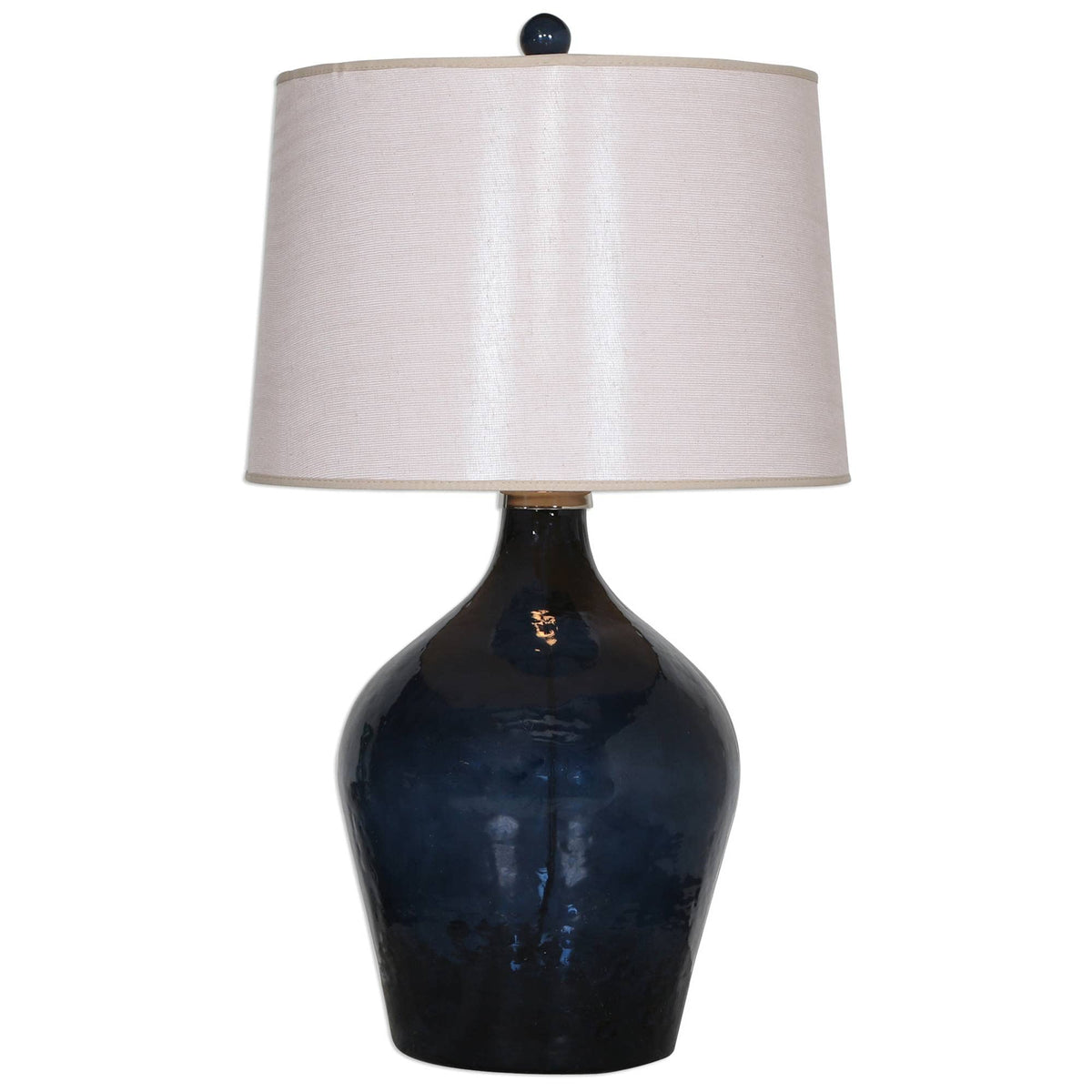 Q: What materials are used in the construction of the Uttermost Lamone Lamp?A: This lamp features a polished nickel finish and is constructed with hammered midnight blue glass, providing a stylish and modern aesthetic.