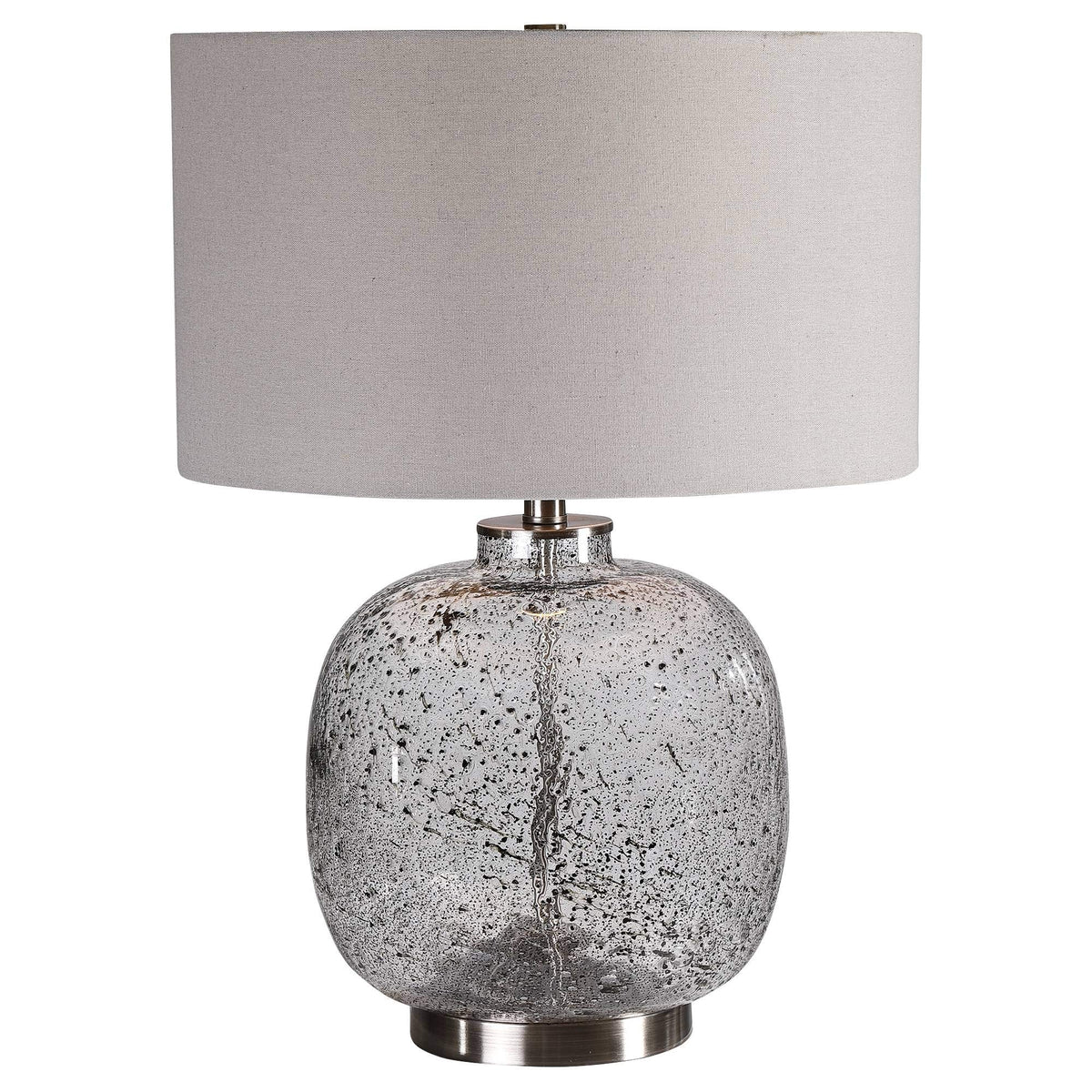 Collection: Storm, Material: Glass, Finish Color: Black/Brushed Nickel, Width: 17", Height: 23.25", Depth: 17", Number Of Bulbs: 1, Wattage: 150 Watts, Dimmable: No, Moisture Rating: Dry Rated, Desc: Modern Style Table Lamp Features A Translucent Art Glass Base With Abstract Black Flecks Throughout, Accented With Brushed Nickel Details. The Round Hardback Drum Shade Is A Light Gray Linen Fabric With Natural Slubbing. Designer: Osvaldo Mendoza / Shade Included: Yes . ,