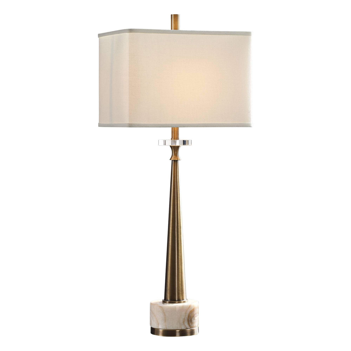 Q: What materials are used in the construction of this lamp?A: This lamp features a combination of antiqued brass, ivory marble, and crystal, along with a sturdy steel base, ensuring both durability and elegance.