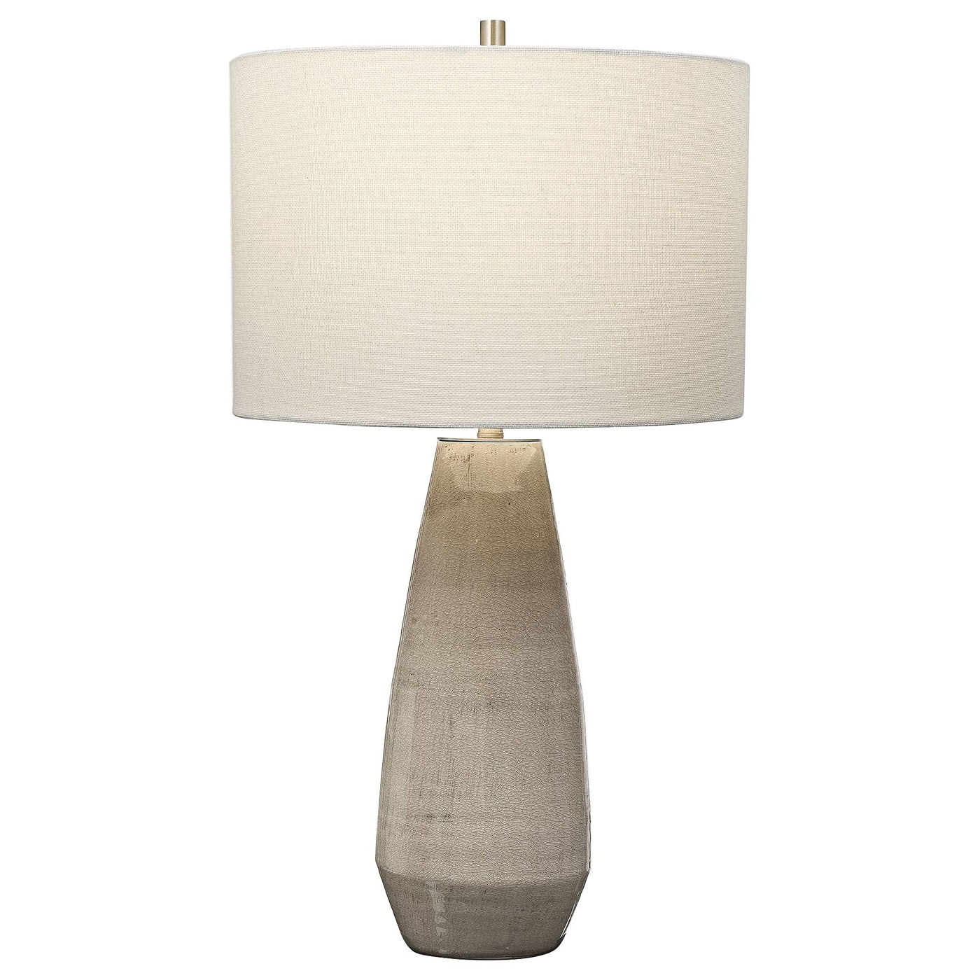 Collection: Volterra, Material: Ceramic, Finish Color: Crackled Taupe-Gray Glaze/Antique Brushed Brass, Width: 15", Height: 27.5", Depth: 15", Number Of Bulbs: 1, Wattage: 150 Watts, Dimmable: No, Moisture Rating: Dry Rated, Desc: Simple Yet Stylish, This Ceramic Table Lamp Is Finished In A Crackled Taupe-gray Glaze With Noticeable Distressed Details And Antique Brushed Brass Accents. The Round Hardback Drum Shade Is A White Linen Fabric. Designer: Osvaldo Mendoza / Shade Included: Yes . ,