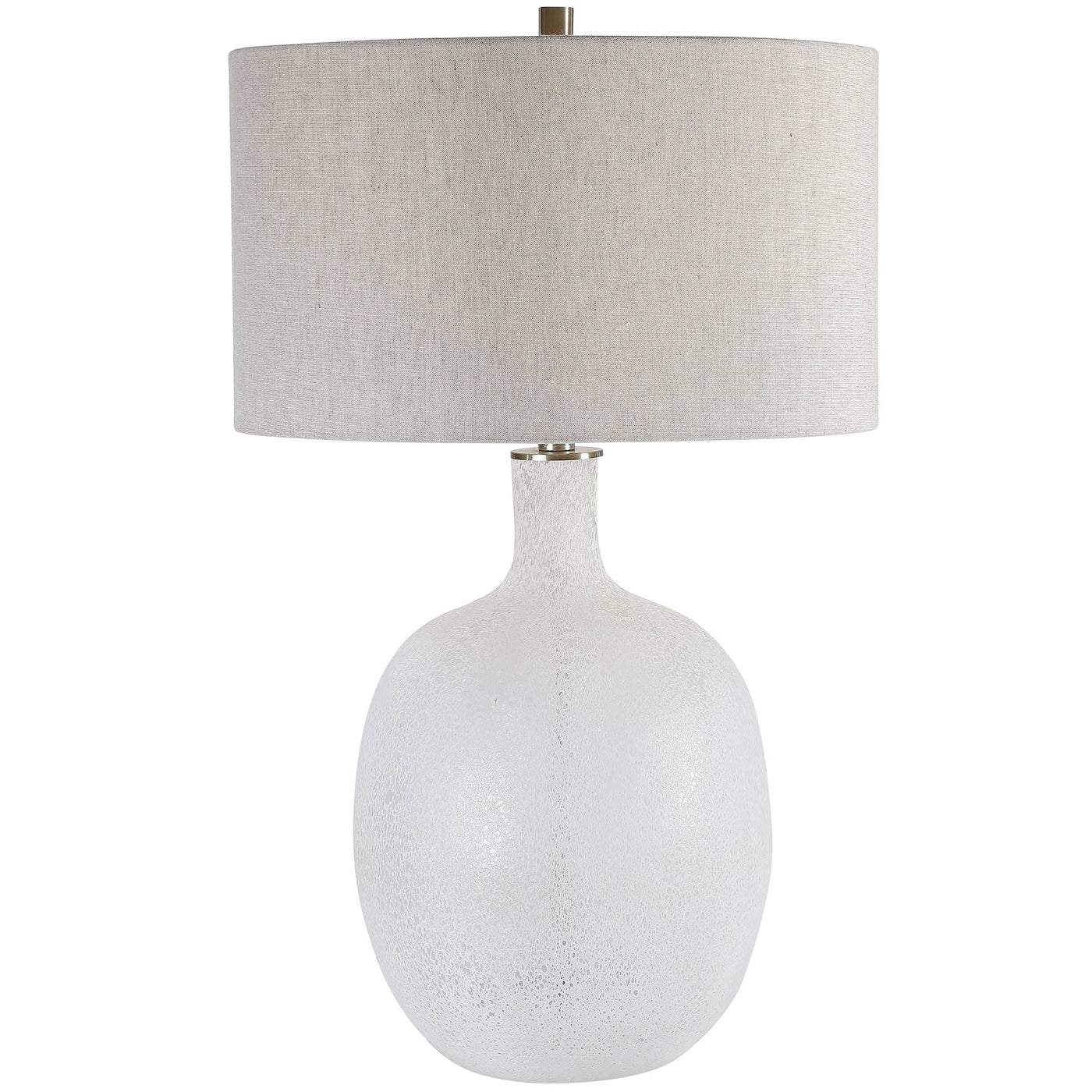 Q: Does the Uttermost Whiteout Table Lamp come with a shade?A: Yes, the lamp includes a round hardback drum shade made from light oatmeal linen fabric that complements its design beautifully.