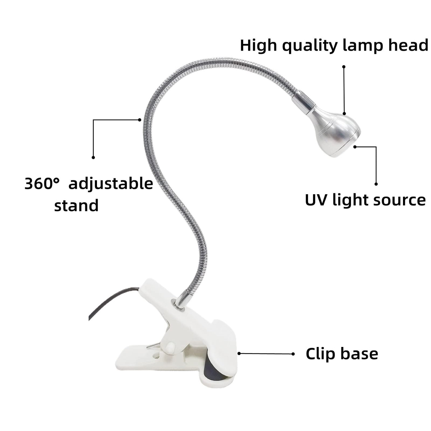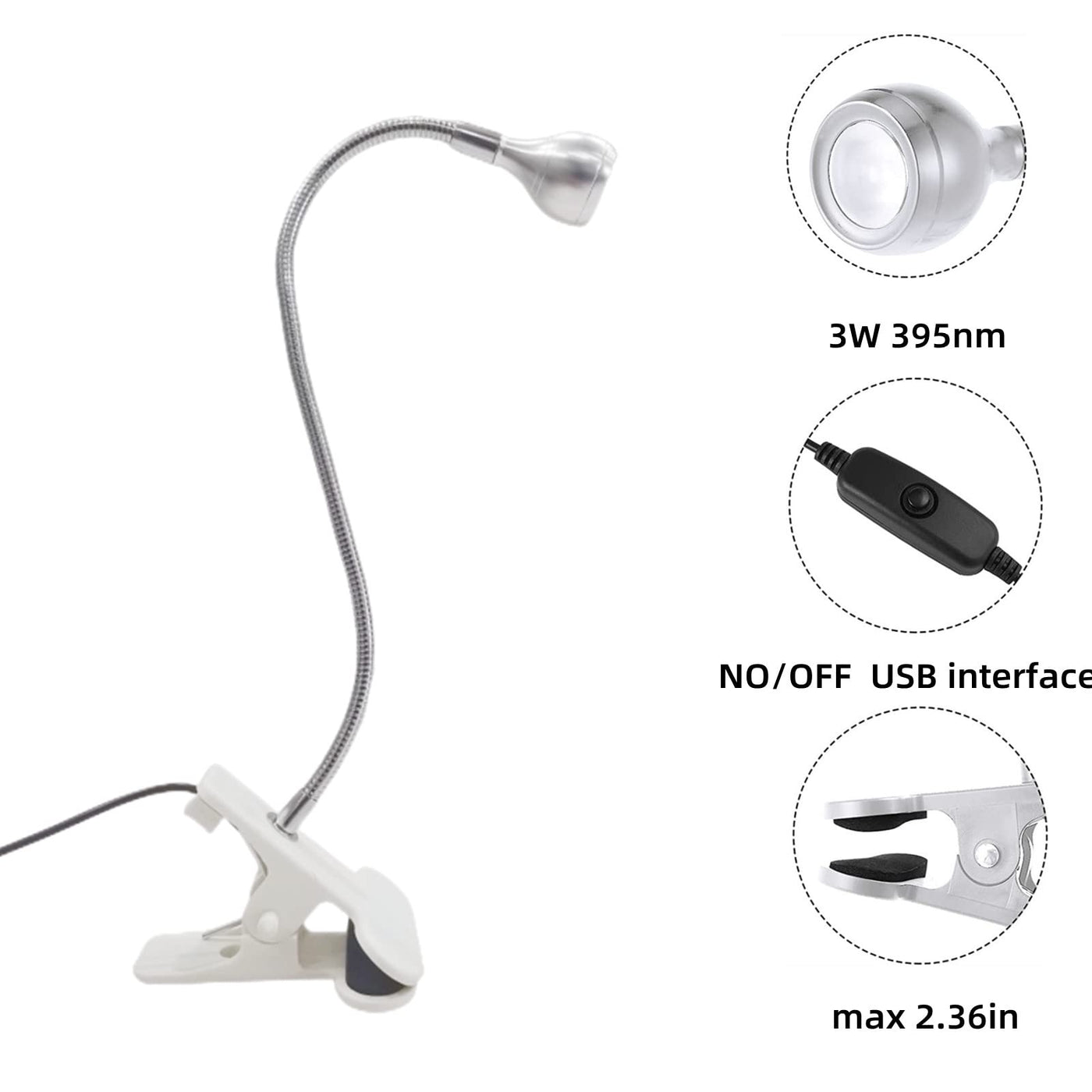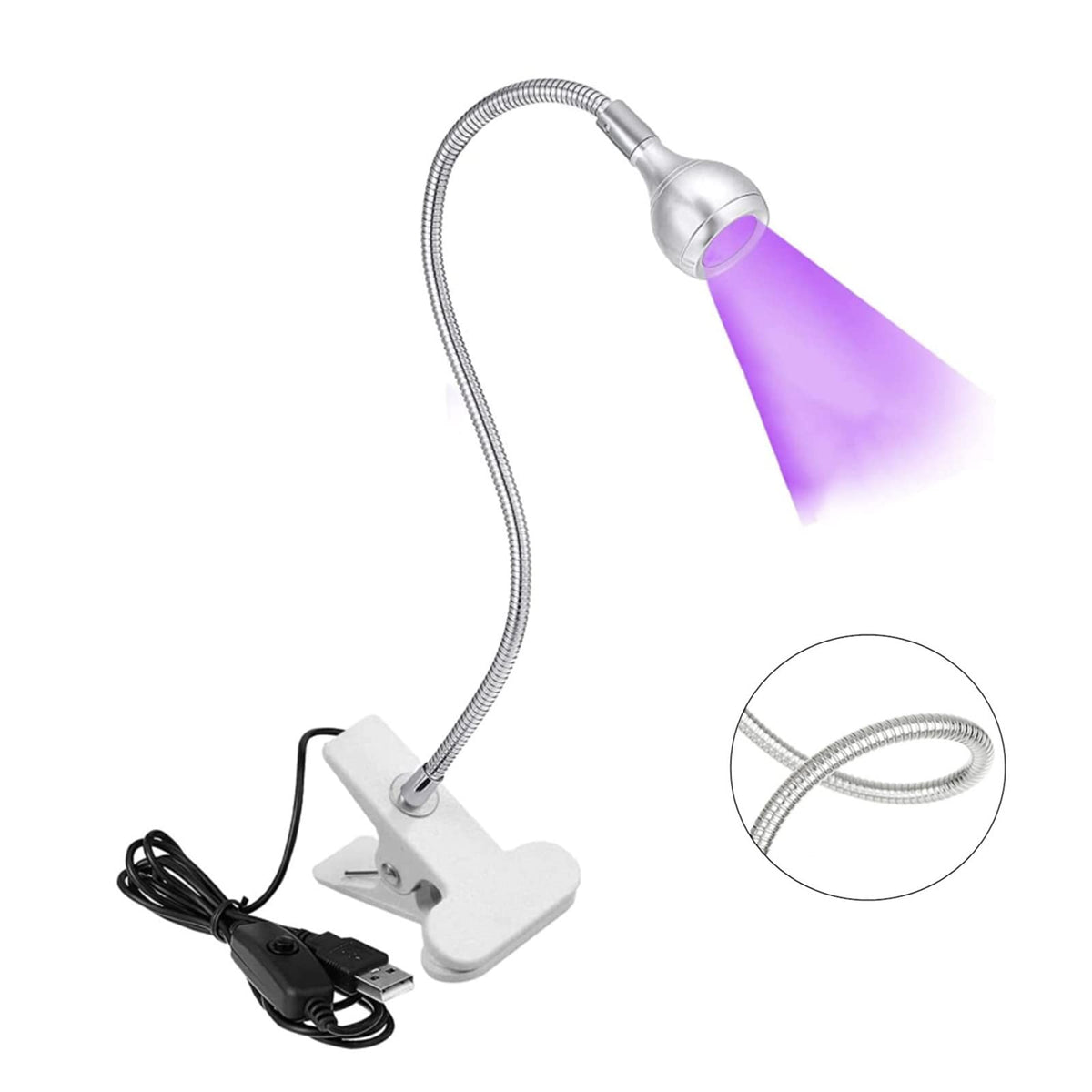 RODUcT SPEcIFIcATIONS:Power--3WWavelength--395nm, UVLED desk lamp is equipped with a single large chip lamp bead to provide you with stable lighting ULTI-PURPOSE LED LIgHT:Not only for Lamp nal polish, repairing phones, can be used to detect fluorescent paint, Ultraviolet curing, resin art, stains, curing, light posters, suitable for stalls, glow parties, lights out parties, outdoor barbecues, etc STURDY & FLEXIBLE:The flexible clip, it is very suitable for fixing to the bedside table, office desk, laptop desk, headboard, The gooseneck can be bent freely in 360 degrees, and the height and direction of the light can be flexibly adjusted to always find the ideal position USB POWERED:The desk clamp light requires constant voltage of 5V and Dc power supply, Support plug and play, convenient to use, suitable for power supply adapter, power bank and computer USB port Phone charging plug is not suggested, which may cause flickering of lamplight AFTER-SALE SERVIcE:All of our products passed the stringent quality test If you product arrived faulty or damaged, please contact our seller support and we will repond by the earliest time We provide 1year warranty service Even if the return window is closed, you can still do this