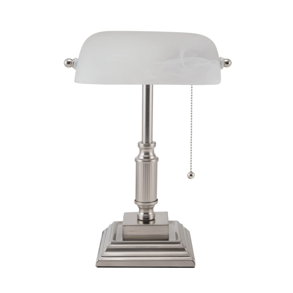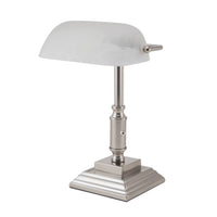 Welcome to our White Shade Banker Lamp Set, the perfect addition to any home or office space.The desk lamp stands tall at 15 inches, making it the perfect size for any desk or workspace.It's equipped with an energy-efficient LED bulb, ensuring that you can enjoy bright and even lighting without worrying about a high electricity bill. The LED bulbs also have a longer lifespan than traditional bulbs, so you won't have to worry about constantly replacing them.In addition to its practicality, this lamp set also adds a touch of style to any room. The white shade gives a clean and modern look, while the traditional banker design adds a touch of vintage charm. The lamps would look equally at home in a study or on a piano, making them a versatile choice for any space.But don't let the vintage design fool you - these lamps are built to last. The high-quality metal base ensures stability, while the adjustable arm allows you to direct the light wherever you need it most. The white shade is made of durable glass, and the lamps come with a convenient on/off switch located on the base.Whether you need a reading lamp for your bedroom or a study lamp for your home office, this White Shade Banker Lamp has you covered. The small size of the lamp makes them ideal for any space, while the LED bulbs provide bright and even lighting for all your reading, working, or studying needs.Add some style and practicality to your home or office with our White Shade Banker Lamp Set today!