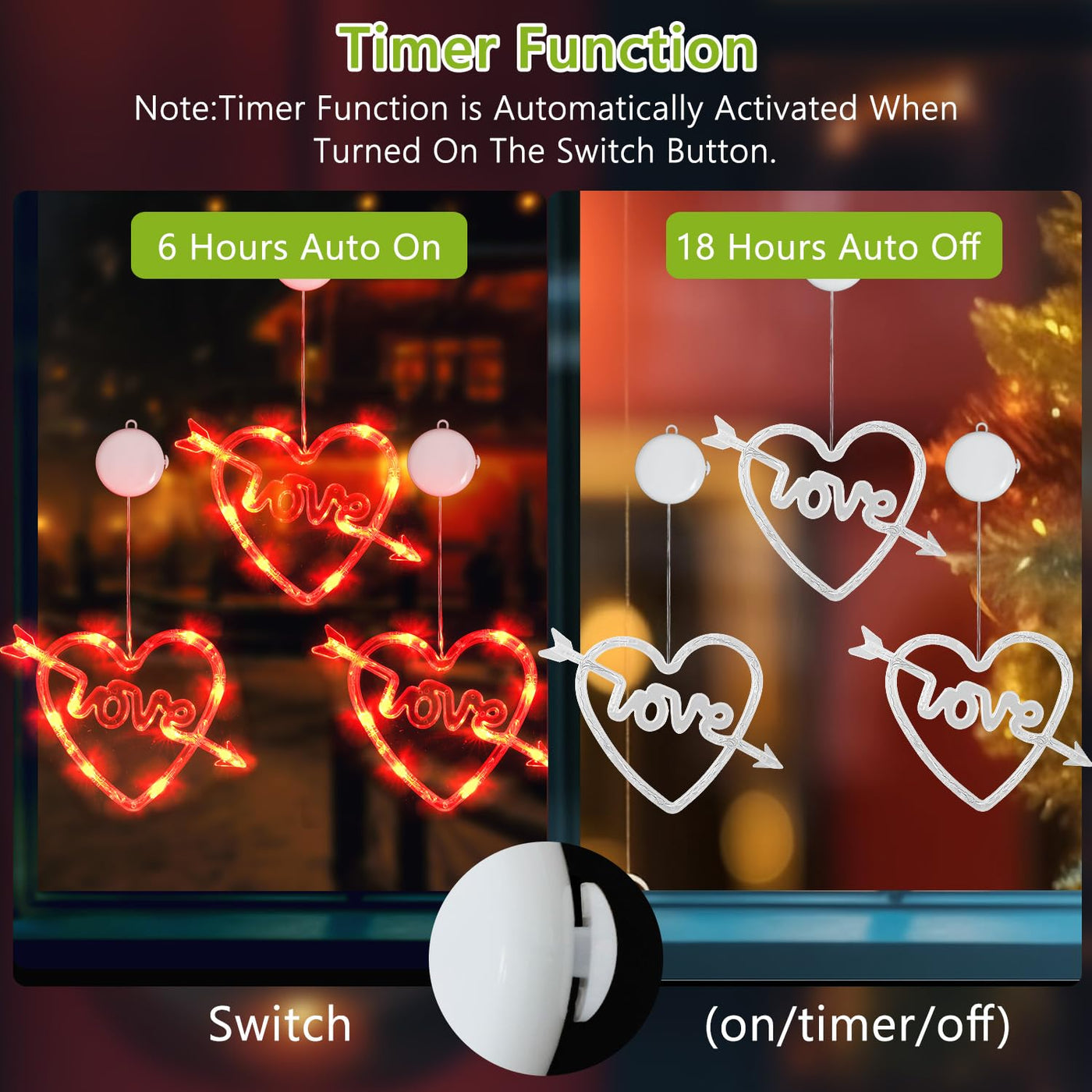 Q: Does the Valentine Day Window Lights come with a timer feature?A: Yes, the lights have an auto timer function that automatically activates when turned on. They operate for 6 hours ON and 18 hours OFF, so you don't have to worry about turning them off every day.