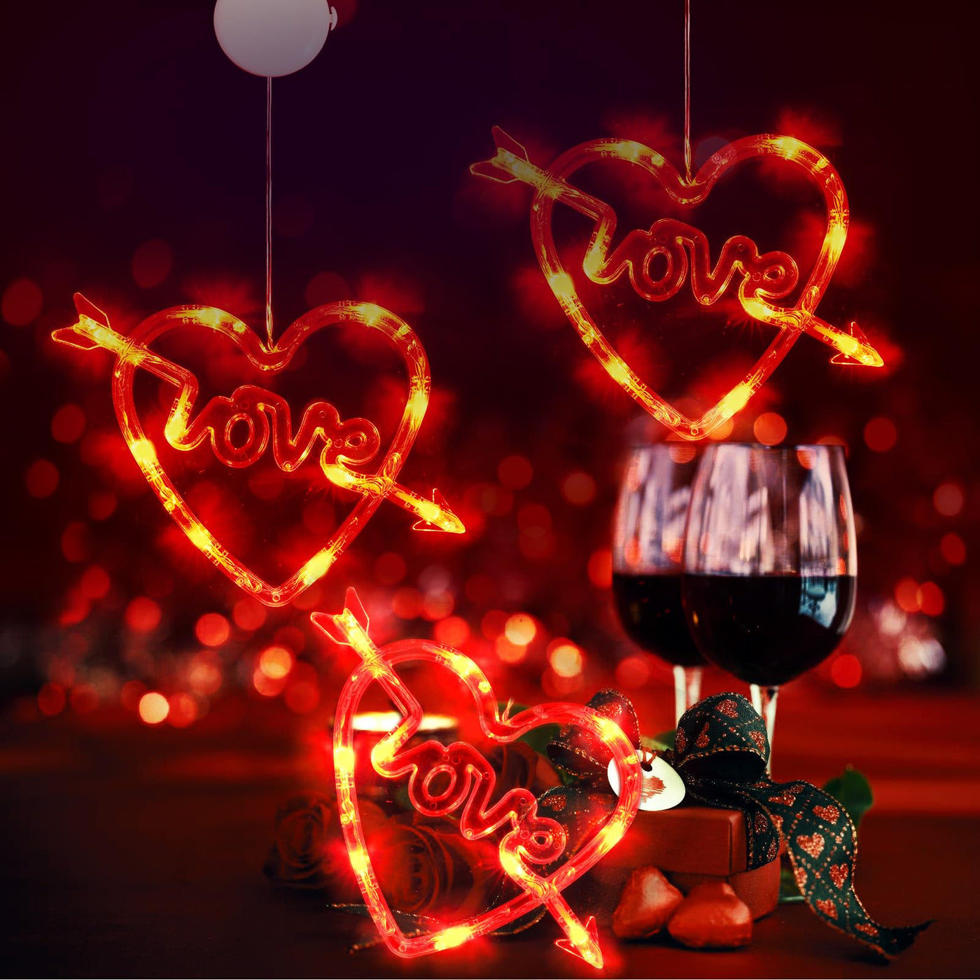 Valentine Day Window Lights,3Pcs Valentines Decorations Heart Lights With Suction Cup,Timer,Battery Operated Indoor String Lights For Home Wedding Anniversary(Red)