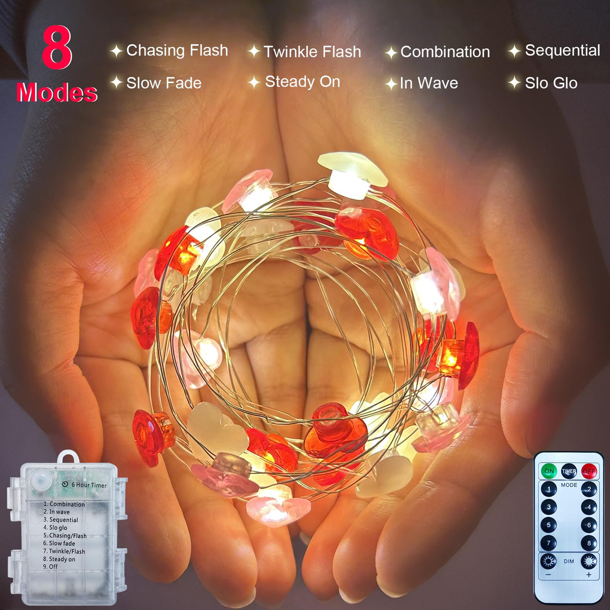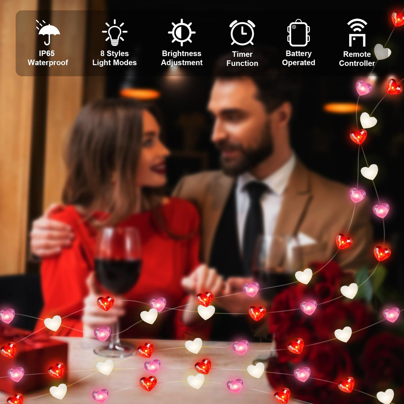 Valentines Day Heart Fairy Lights-14.4FT 40LED Battery Powered Red Pink White Heart Twinkle String Lights with 8 Modes Timer Remote Waterproof Indoor Bedroom Valentines Decorations Lights