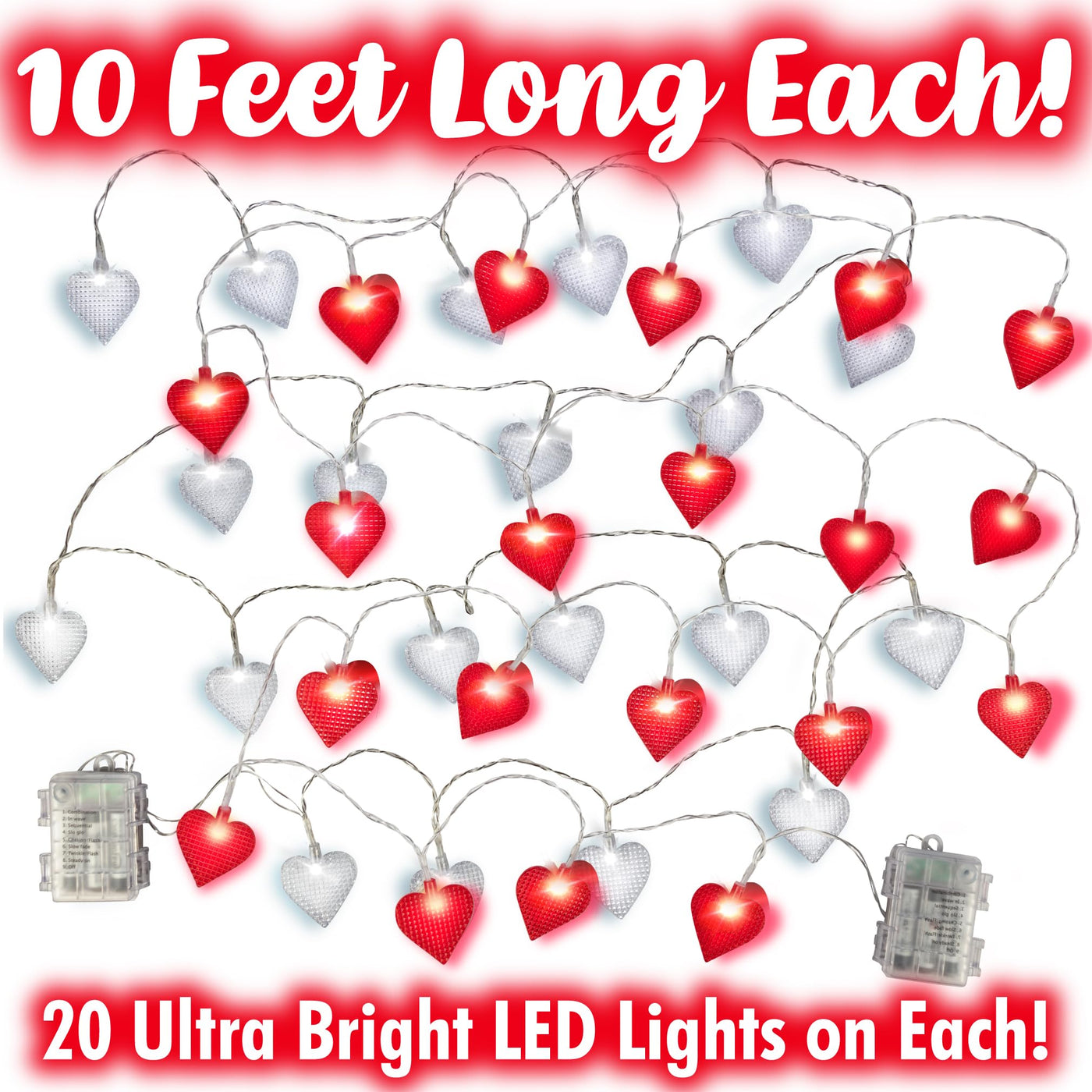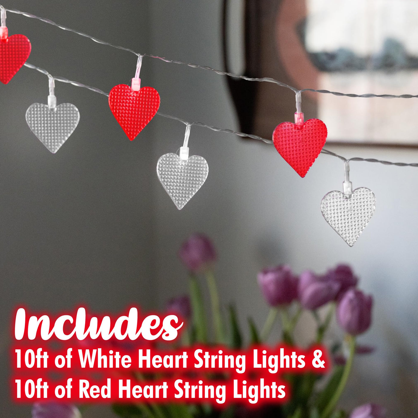 Valentines Day Red & White Heart 10ft String Lights- 2pk w 40 Total LED Fairy Lights- Easy to Hang & Battery Powered- 9 Differen