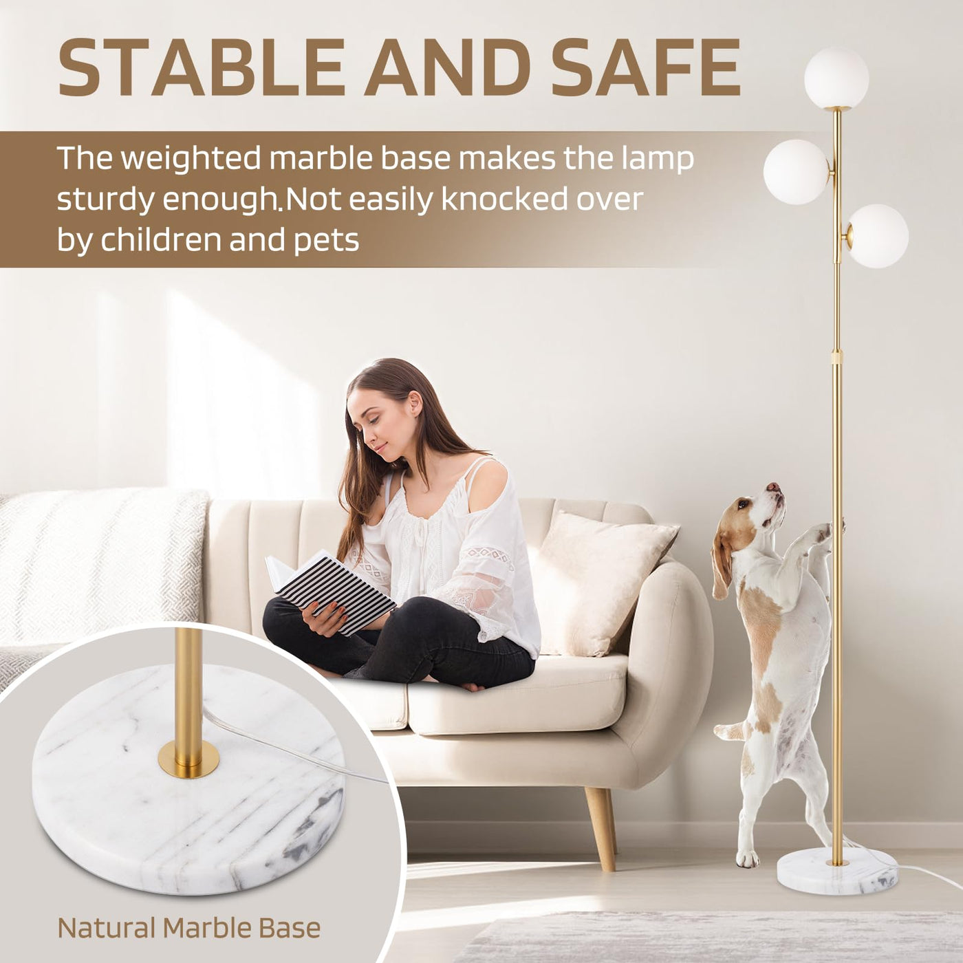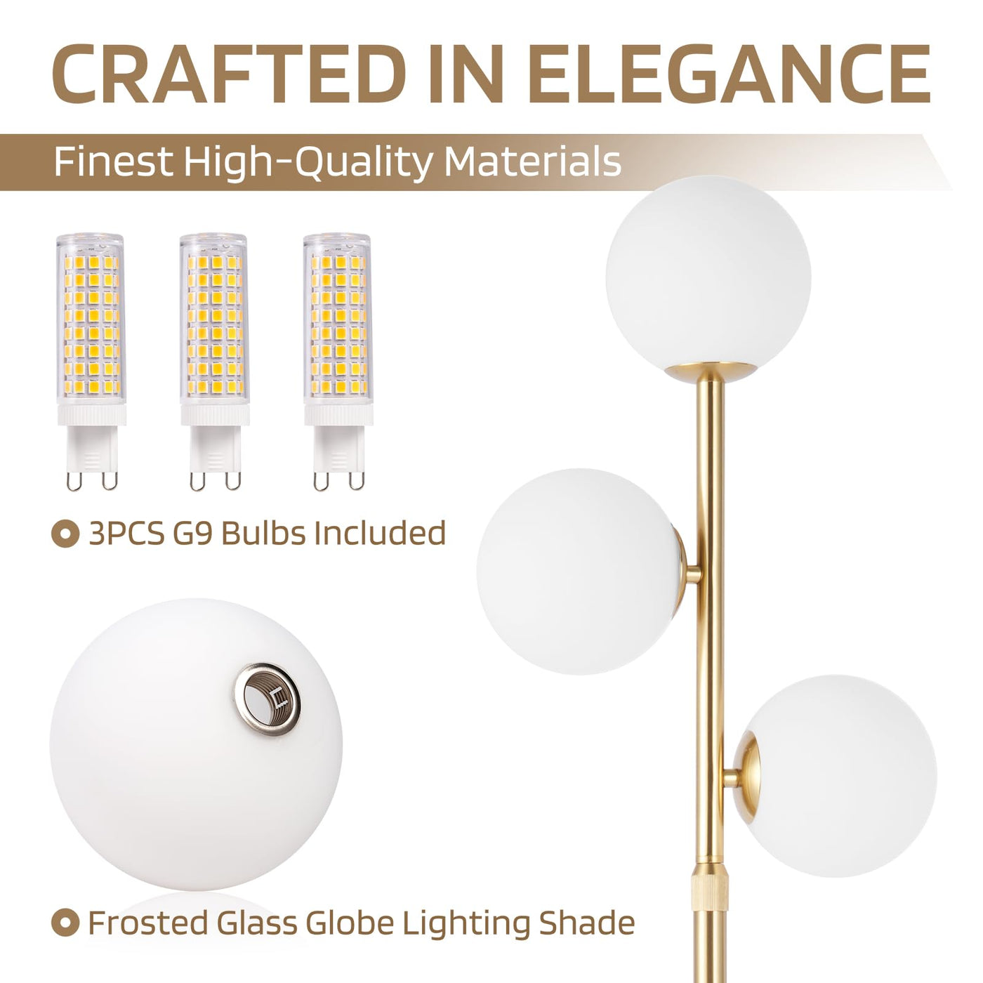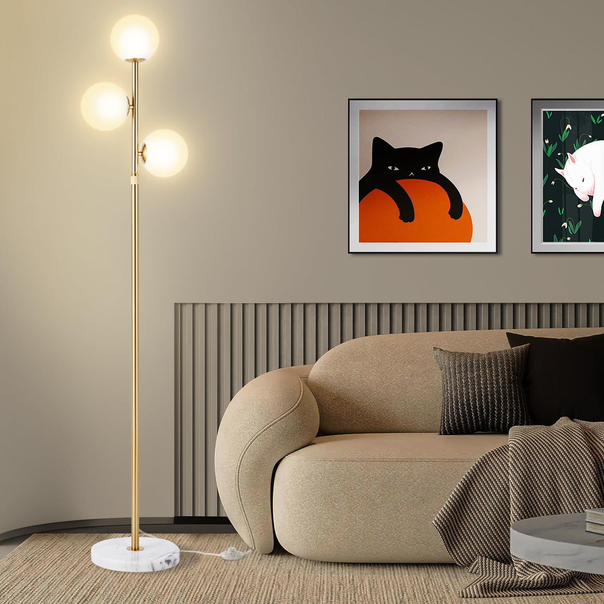 - VALLERICO Stylish 3-Globe Floor Lamp | Perfect Home Lighting & Decor Illuminate your living space with elegance and warmth! This modern 3-Head Glass Globe Floor Lamp combines modern aesthetics with practical functionality, making it an essential lighting choice for your home. * Soft, Diffused Lighting: The frosted white glass globe shades provide a gentle, warm glow that creates a relaxing ambiance, perfect for any room without being harsh on the eyes. * Premium Quality Design: The gold lamp pole, crafted with a brushed electroplated finish, adds a touch of luxury and sophistication, elevating your home decor. * Adjustable Height: With a height range of 55 inches to 67 inches, you can easily customize this floor lamps for living room to suit your lighting needs and fit perfectly into any room. * Sturdy Marble Base: The heavy marble base provides stability, making it safe for homes with children or pets, so you can enjoy peace of mind. * Convenient Foot Switch: The foot switch allows for easy on/off operation, making it simple to control the light without bending down. * Easy Assembly: This mid century modern lamp is designed for quick and hassle-free assembly, allowing you to enjoy beautiful lighting in no time. * Ideal Gift Choice: Perfect for housewarmings, birthdays, or any occasion, this stylish floor lamp is a thoughtful gift that combines functionality and elegance. Specifications Material: Metal, Marble, Glass Product Height: Adjustable from 55 to 67 inches Switch Type: Foot Switch Voltage: 110-120V Base Type: G9 Style: Modern, Mid Century Supportive Wattage: 60W Max Package Contains 1 x Marble Base 3 x Lamp Poles 3 x G9 LED Bulbs 3 x Glass Globe Shades 1 x User Manual