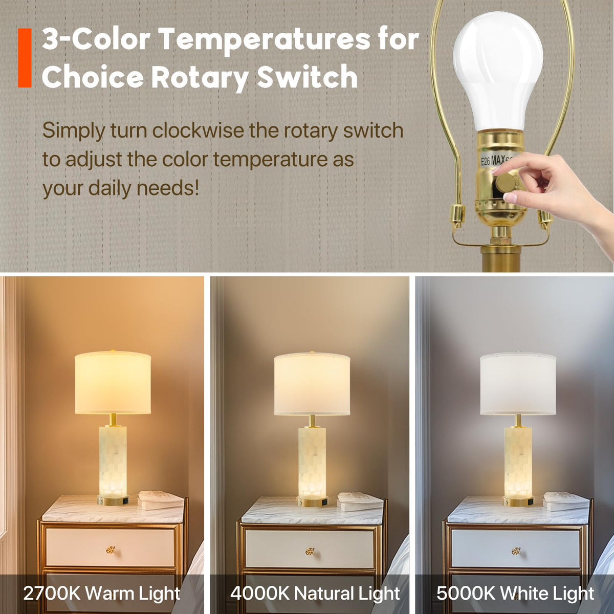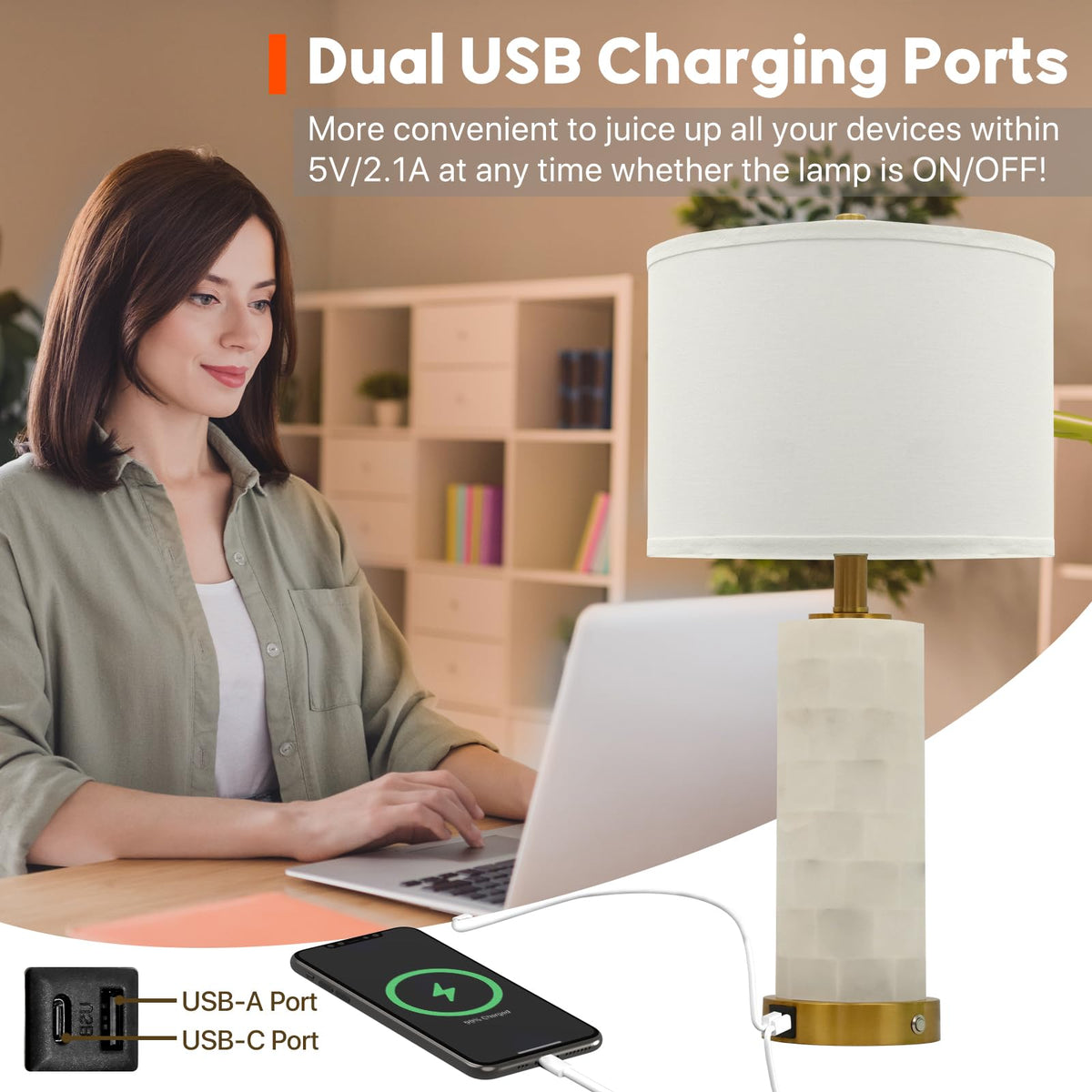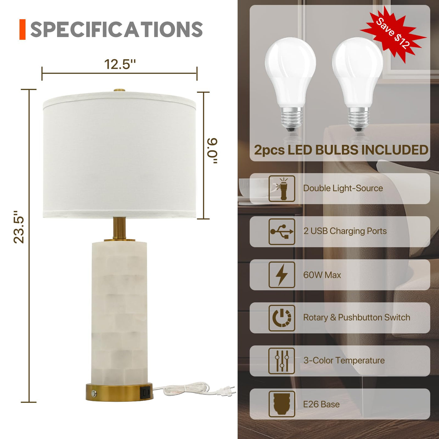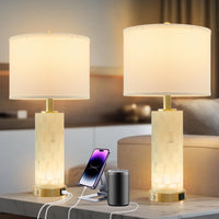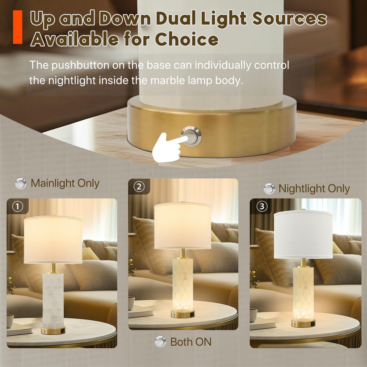 - Vallerico Natural Alabaster Nightstand Table Lamp Set Of 2 - Dual Light Source Design: This Bedroom Lamps For Nightstand Features A Main Light And A Night Light In Base, Offering More Even Illumination. It Seamlessly Adapts To Various Lighting Needs, Whether You Desire Focused Brightness Or A Soft Ambient Glow.The Main Light Source Is Controlled By A Rotary Switch, While The Night Light Is Controlled By A Button On The Base. Natural Marble Lamp Body: Crafted From Brazilian Natural Marble, The Lamp Body Is Expertly Cut And Handcrafted To Display Unique Veining And An Elegant Texture, Infusing A Touch Of Luxury Into Your Home Decor. Built-In Night Light: Featuring A Built-In Night Light, This Night Stand Lamp For Bedroom Creates A Warm, Inviting Atmosphere When Lit. It Is Perfect For Nighttime Reading, Relaxing, Or Serving As A Night Light, Providing A Soothing And Comfortable Lighting Experience. Exquisite Craftsmanship: Each Bedroom Nightstand Lamps Is Meticulously Polished And Assembled By Skilled Artisans, Ensuring Top-Notch Quality. The Unique Natural Patterns Of Each Lamps For Living Room End Tables Make Every Piece A Singular Work Of Art. Versatile Usage: Ideal For Bedrooms, Studies, Living Rooms, Or Offices, This Table Lamp With Usb Port Functions Both As A Practical Lighting Solution And A Stylish Decor Piece, Enhancing The Beauty And Elegance Of Any Space. 3-Color Temperature Lamps With Usb Ports Our Nightstand Lamps Set Of 2 Offer 3 Color Temperatures (2700K/4000K/5000K) To Meet Your Daily Lighting Needs In Different Occasions! 2700K Warm White Is Great For Nightstand Lighting, 4000K Natural White Is A Perfect Choice For Basic Daily Lighting, And 5000K Daylight White Is Highly Suited For Reading Or Working. Usb A+C Charging Ports Are Available When Ever The Night Stand Lamps Set 2 Is Turn On Or Off! Each Usb Table Lamp'S Base Is Built-In Two 5V/2.1A Usb A+C Ports, You Can Charge Your Two Electronic Devices Simultaneously At Any Time, Which Can Solve The Problem Of Insufficient Sockets And Keep Your Desktop Clean. Specifications Material: Metal, Marble, Fabric Product Height: 23.5 Inch Switch Type: Rotary Switch & Pushbutton Voltage: 110-120V Base Type: E26 Charging Ports: Usb A+C Style: Modern Supportive Wattage: 60W Max Package Contains 2 X Marble Lamp Body 2 X White Fabric Lampshades 2 X 9W Led Bulbs 1 X User Manual
