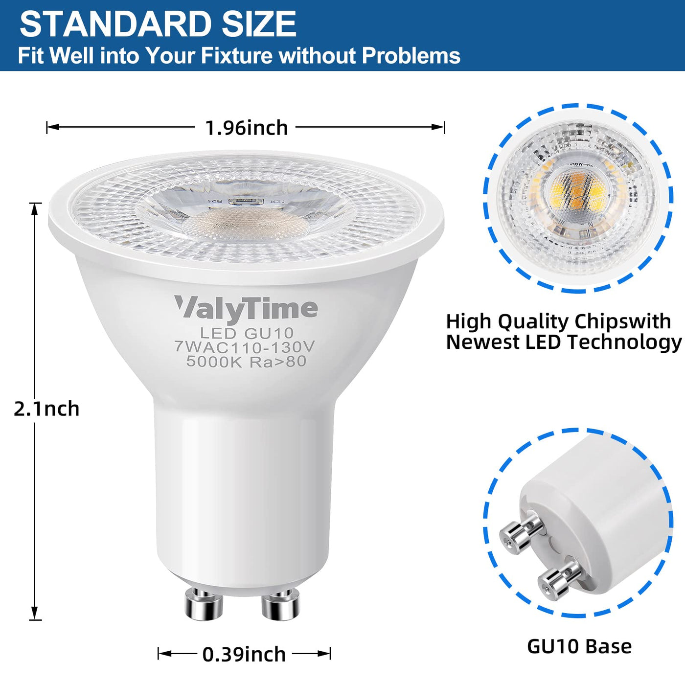 Valytime Gu10 Led Light Bulbs 7W, 5000K Day White, 10 Pack, Halogen Replacement,
