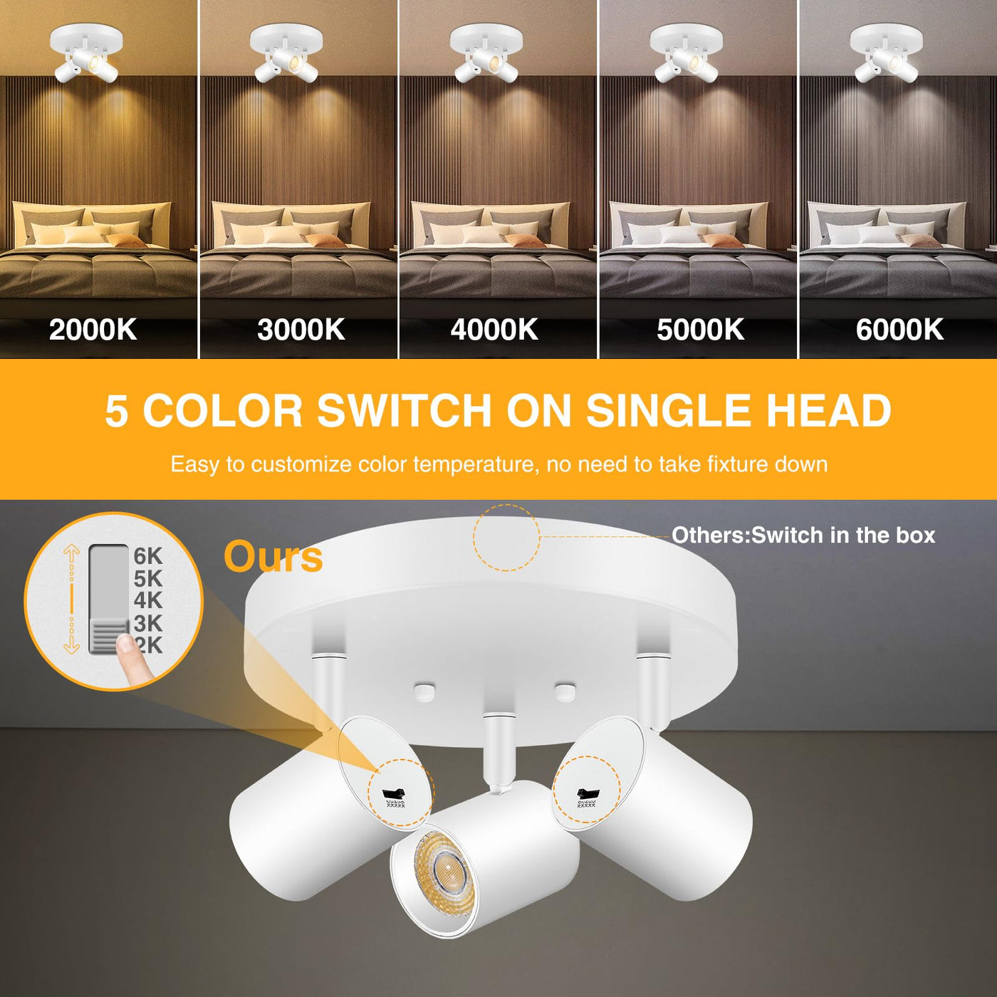 ??5 Color Adjustable: Choose from five color temperature settings (2000K, 3000K, 4000K, 5000K, 6000K) using the convenient slider on the back of each light head.