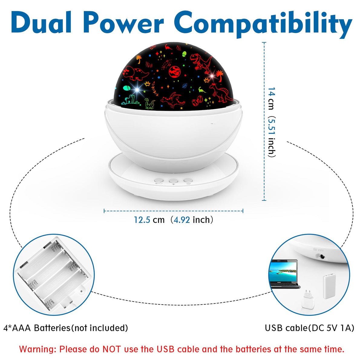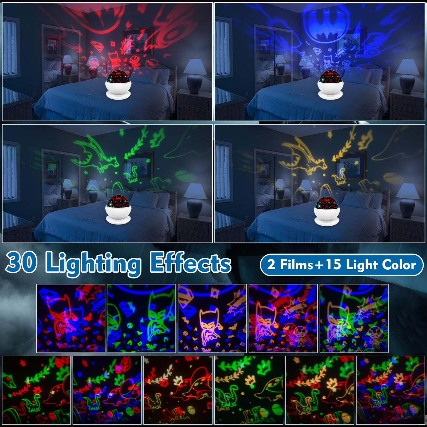 Q: Can the night light project different colors and themes?A: Yes, this night light projector offers 15 color-changing modes and includes two theme films featuring various dinosaurs and superhero patterns. This versatility allows children to enjoy a dynamic visual experience.