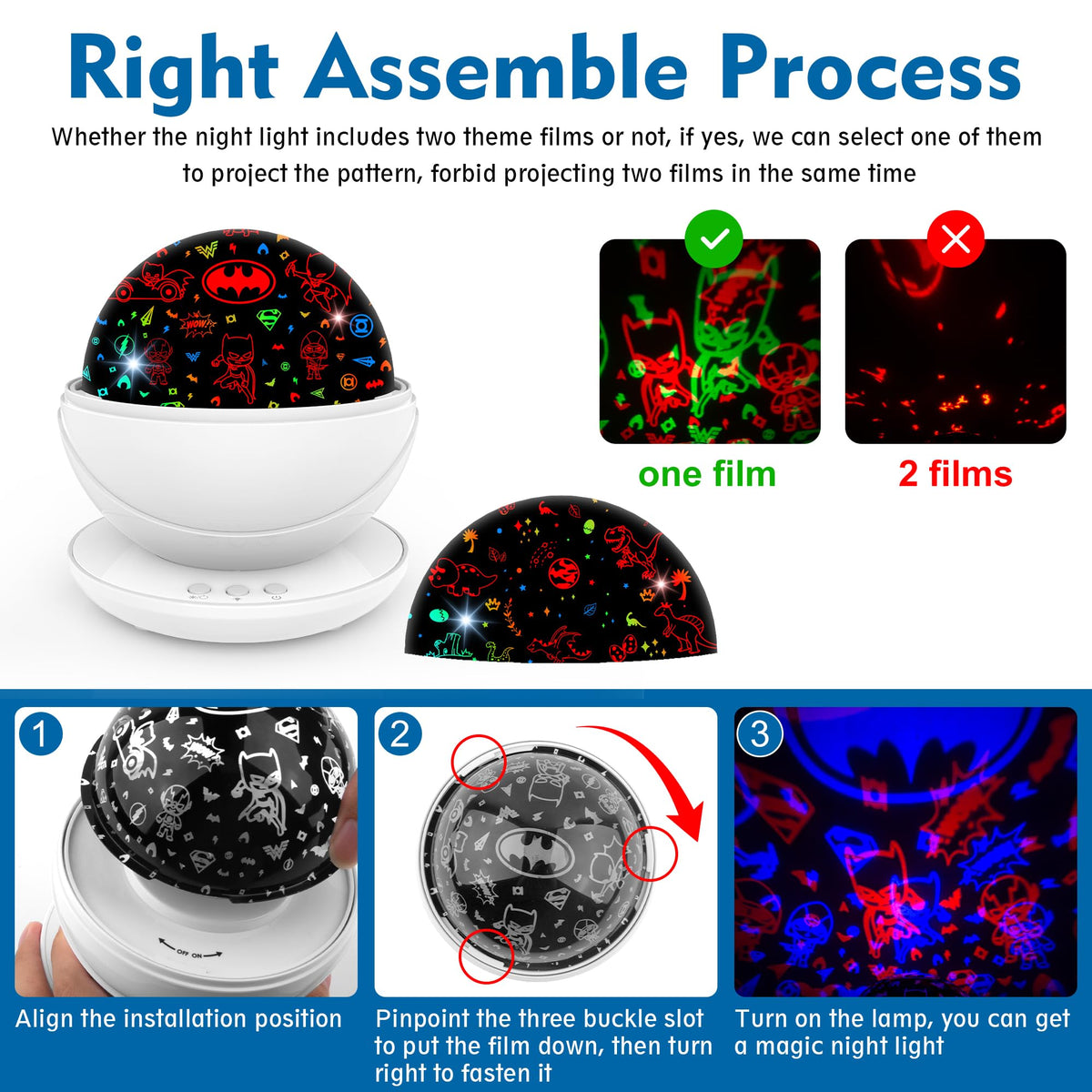 The Dark Knight Night Light: 2023 NEW Batman projector has different cartoon characters: 4 different shapes Batman/Wonder Woman/superman/The Flash/Green Arrow, which can be projected on the wall or ceiling. Our boy is very glad to lie on the bed to play with it and parents don't worry about the kid's sleep problem, superhero will protect our baby to smooth them and fall asleep quickly
