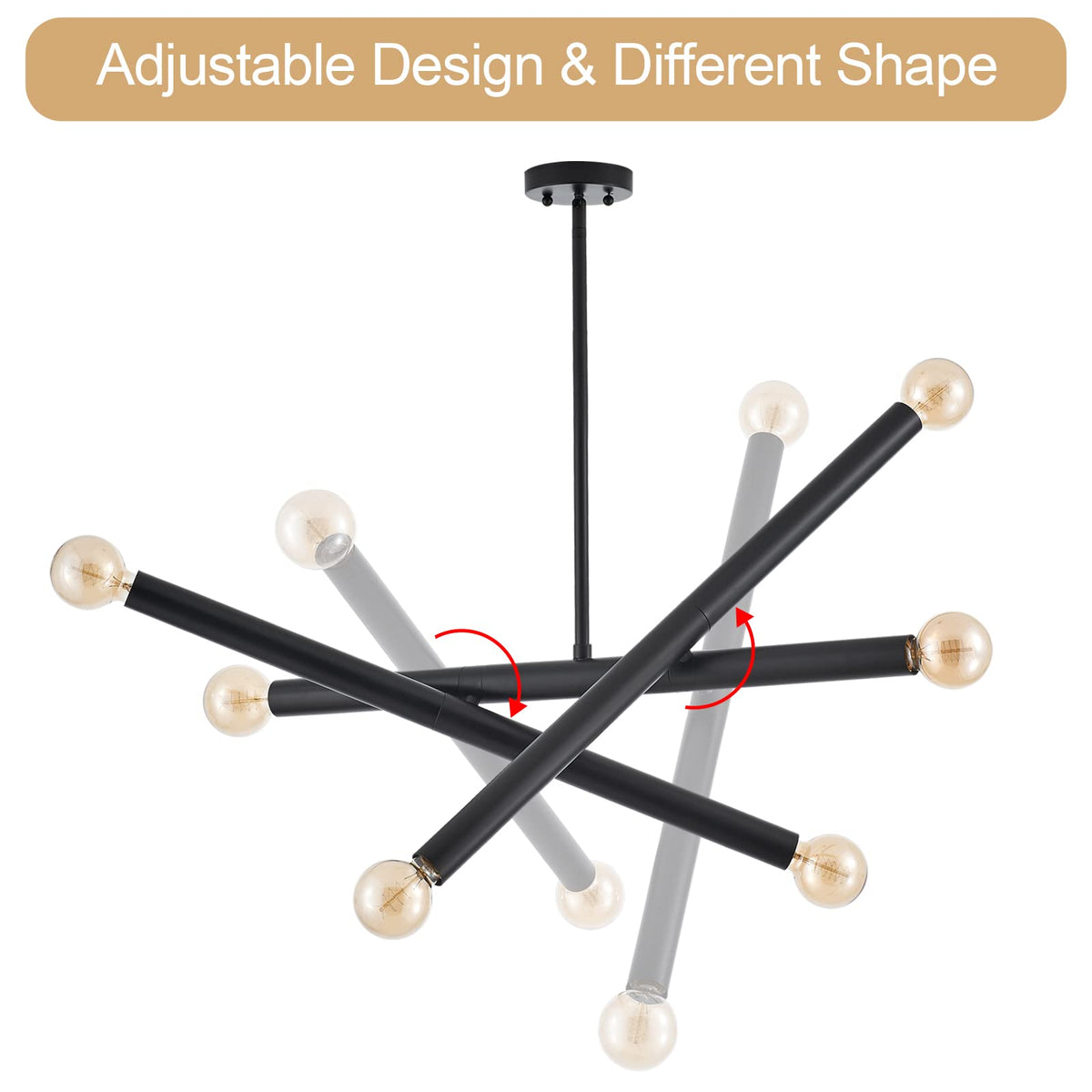 Hang this 6-light chandeliers for dining room to fill your room with brilliant multi-directional illumination. More than just illumination, this entryway chandelier provides an artful focal point for your ensemble.Crafted from metal with black finishes, it features three adjustable light arms. Each 60W bulb (not included) is exposed and does not include a shade, giving the fixture an industrial and modern look. This modern farmhouse dining light fixture creates a fascinating focal point for your dining room. This modern farmhouse chandelier is perfect for the kitchen island, bedroom, hallway, restaurant, laundry room, living room, entryway, bathroom, foyer, stairway, and loft. This sputnik pendant light fixture has full details instructions and well-packed hardware parts. You will easily install this black sputnik chandelier, save your time and be happy to enjoy your new decoration.Also, this kitchen light chandelier is fully dimmable with a compatible dimmer switch to create the perfect atmosphere.Specification:Materials: MetalBulb Requirement: 6 * E26 Bulb, per bulb MAX 60W (Bulbs Not Included)Voltage: 110VMounting Accessory Included: Yes