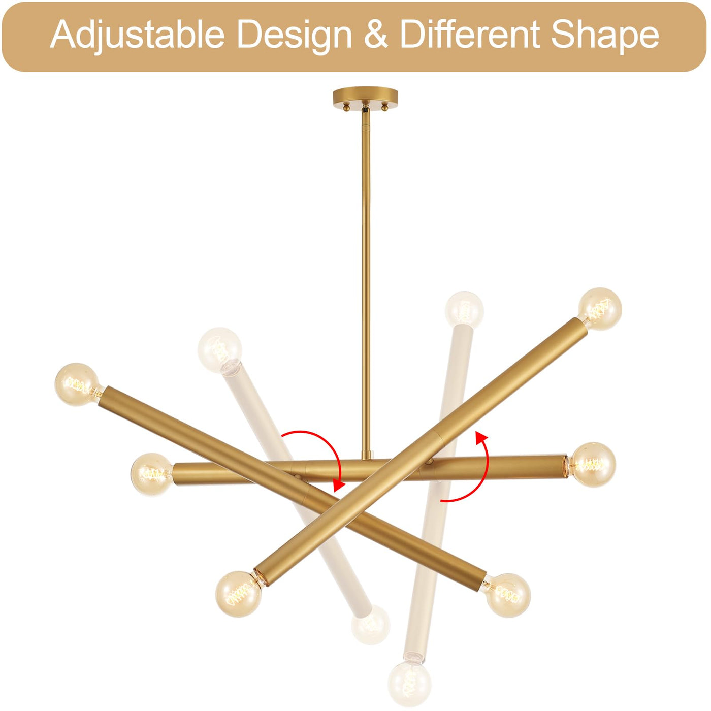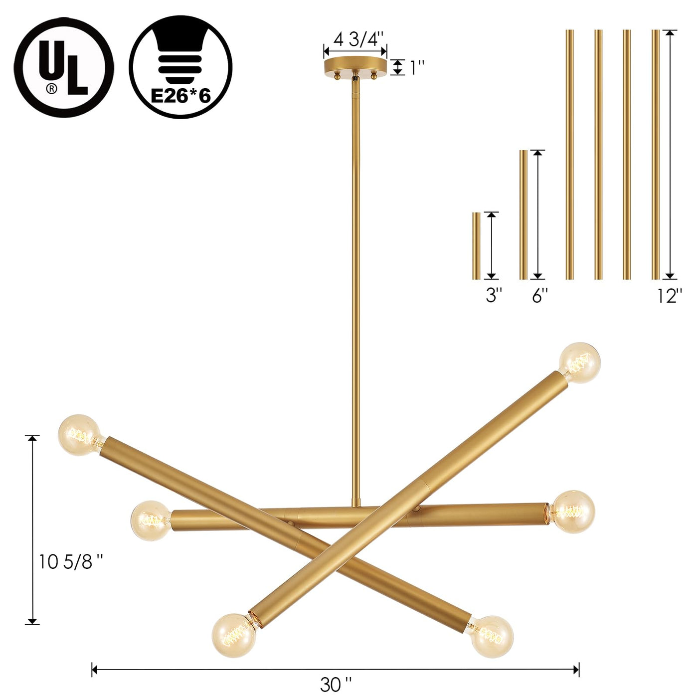 Hang This 6-Light Chandeliers For Dining Room To Fill Your Room With Brilliant Multi-Directional Illumination. More Than Just Illumination, This Entryway Chandelier Provides An Artful Focal Point For Your Ensemble.Crafted From Metal With Gold Finishes, It Features Three Adjustable Light Arms. Each 60W Bulb (Not Included) Is Exposed And Does Not Include A Shade, Giving The Fixture An Industrial And Modern Look. This Modern Farmhouse Dining Light Fixture Creates A Fascinating Focal Point For Your Dining Room. This Modern Farmhouse Chandelier Is Perfect For The Kitchen Island, Bedroom, Hallway, Restaurant, Laundry Room, Living Room, Entryway, Bathroom, Foyer, Stairway, And Loft. This Sputnik Pendant Light Fixture Has Full Details Instructions And Well-Packed Hardware Parts. You Will Easily Install This Gold Sputnik Chandelier, Save Your Time And Be Happy To Enjoy Your New Decoration.Also, This Kitchen Light Chandelier Is Fully Dimmable With A Compatible Dimmer Switch To Create The Perfect Atmosphere.Specification:Materials: Metalbulb Requirement: 6 * E26 Bulb, Per Bulb Max 60W (Bulbs Not Included)Voltage: 110Vmounting Accessory Included: Yes