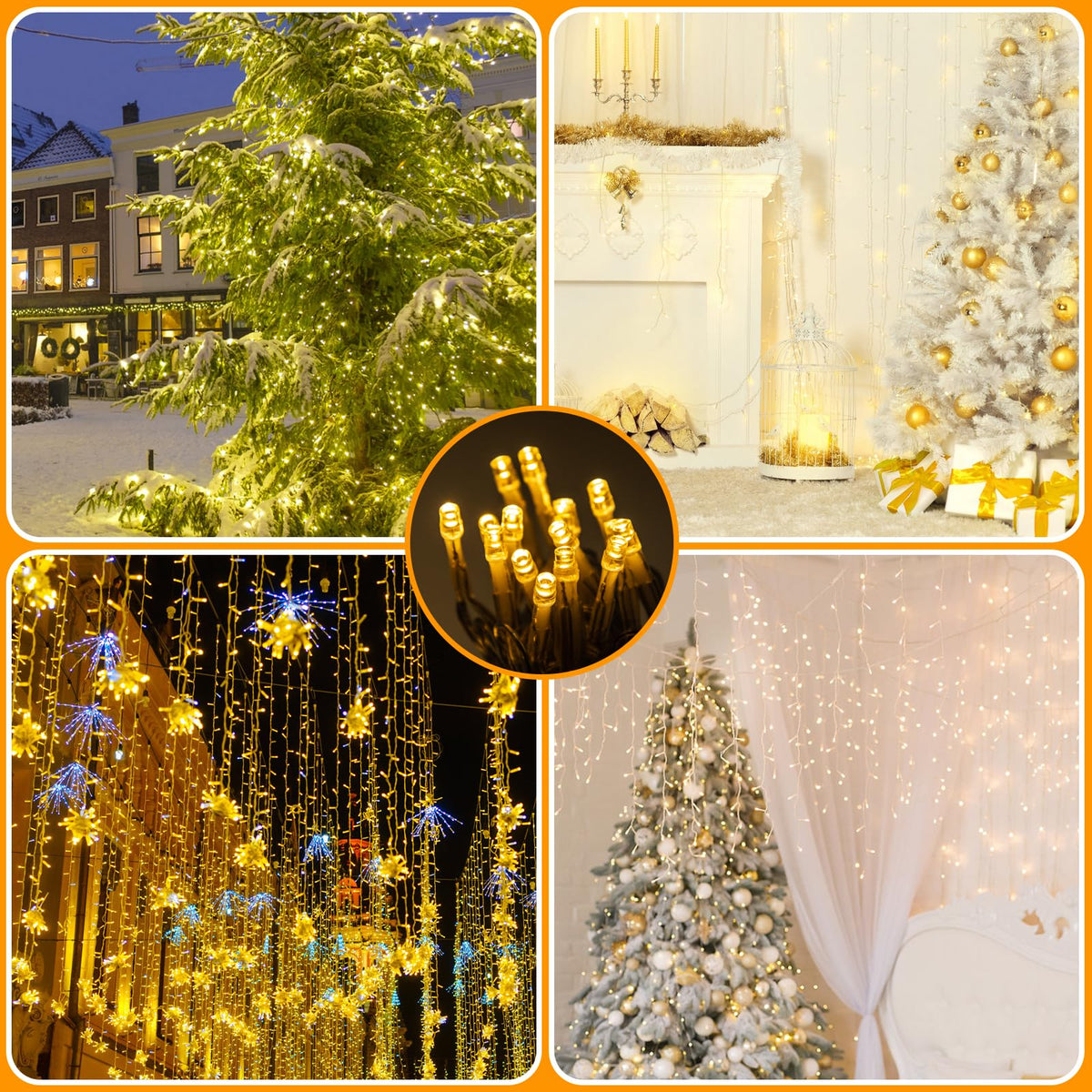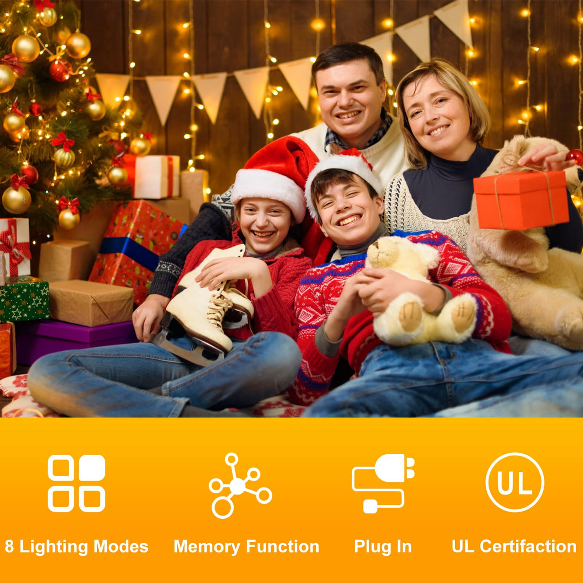 VARMEPALS christmas light has total of 200 LEDs. Perfect for decorating bedrooms, weddings, parties and living spaces. The christmas light is IP44 Waterproof rating, which means these LED lights can withstand rainy weather condition, perfect for indoor or outdoor usage. Note: The plug adapter is not waterproof. UL-certified 31V low-voltage plug ensures safety. It's safe to touch. You can use the plug in fairy lights at any time and save the trouble of changing batteries. The 200 LED indoor Christmas lights provides 8 lighting mode options. Included 1 steady-on mode and 7 flashing modes: combination, in waves, sequential, slo-glo, chasing/ flash, slow fade, and twinkle/flash. The lighting mode can be adjusted via the buttons on the plug or remote. Safe Flexible: this string light is insulation silicone, making it well-insulated, safe to touch even after a long time using. Sturdy and flexible silver wire, you can easily bend it to fit your needs. The Fairy lights with clear wire cable can easily hide in any scene to make indoor and outdoor decorations perfectly. Twinkle lights will create a fantastic scene without obvious wires.